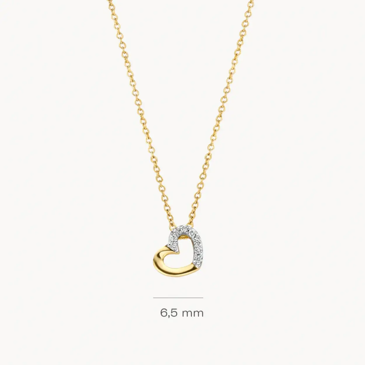Aan dit 14k gouden collier glinstert een wit- en geelgouden hart dat voor de helft bezet is met briljant geslepen diamanten. De diamantjes hebben een totaalgewicht van 0,03 karaat en het collier is 42 cm lang. Dit prachtige sieraad is een liefdevol geschenk aan een dierbaar iemand of gewoon aan jezelf.