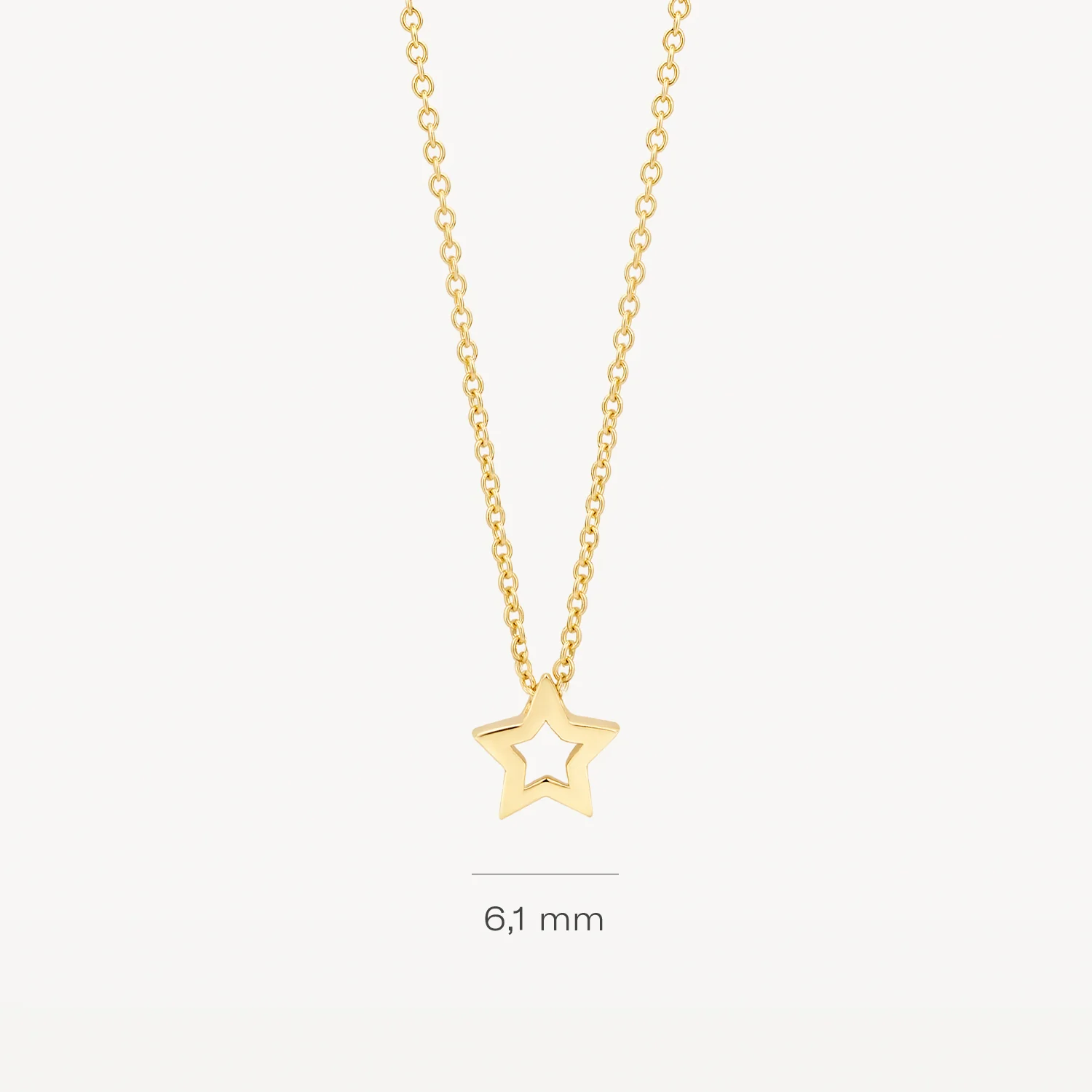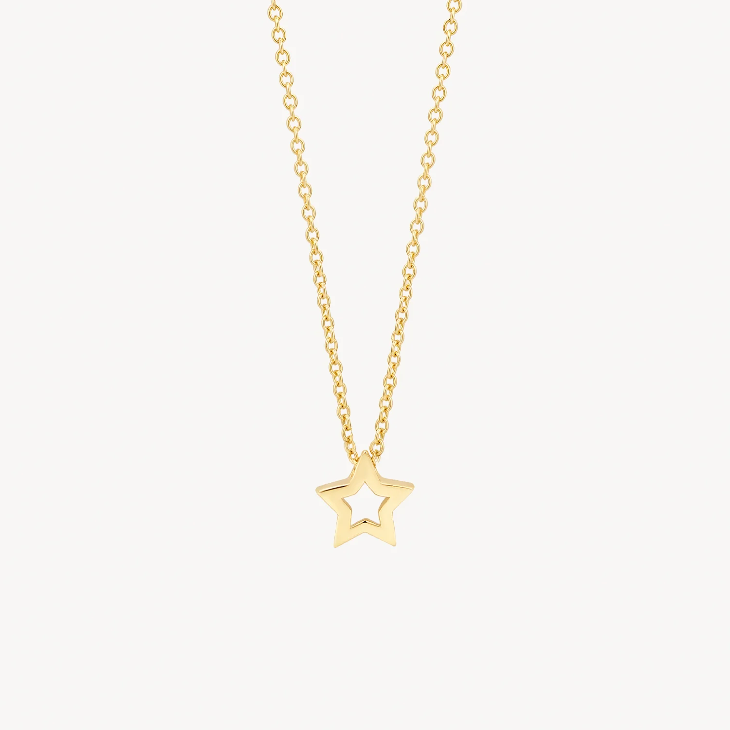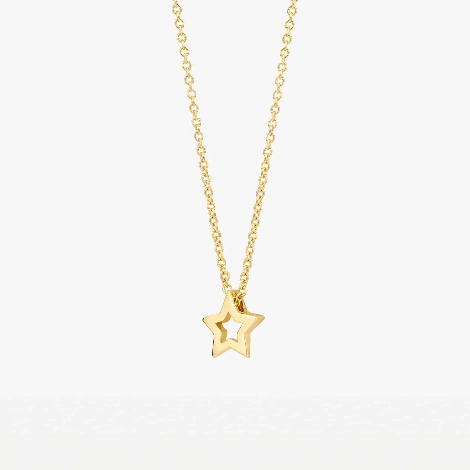 Dit stijlvolle 14k geelgouden collier met roloschakels heeft een speelse, stervormige hanger. De lengte van het collier is 42 cm en de doorsnede van de hanger is 9 mm. Mooi op zichzelf maar ook goed te combineren met andere sieraden uit onze collectie.