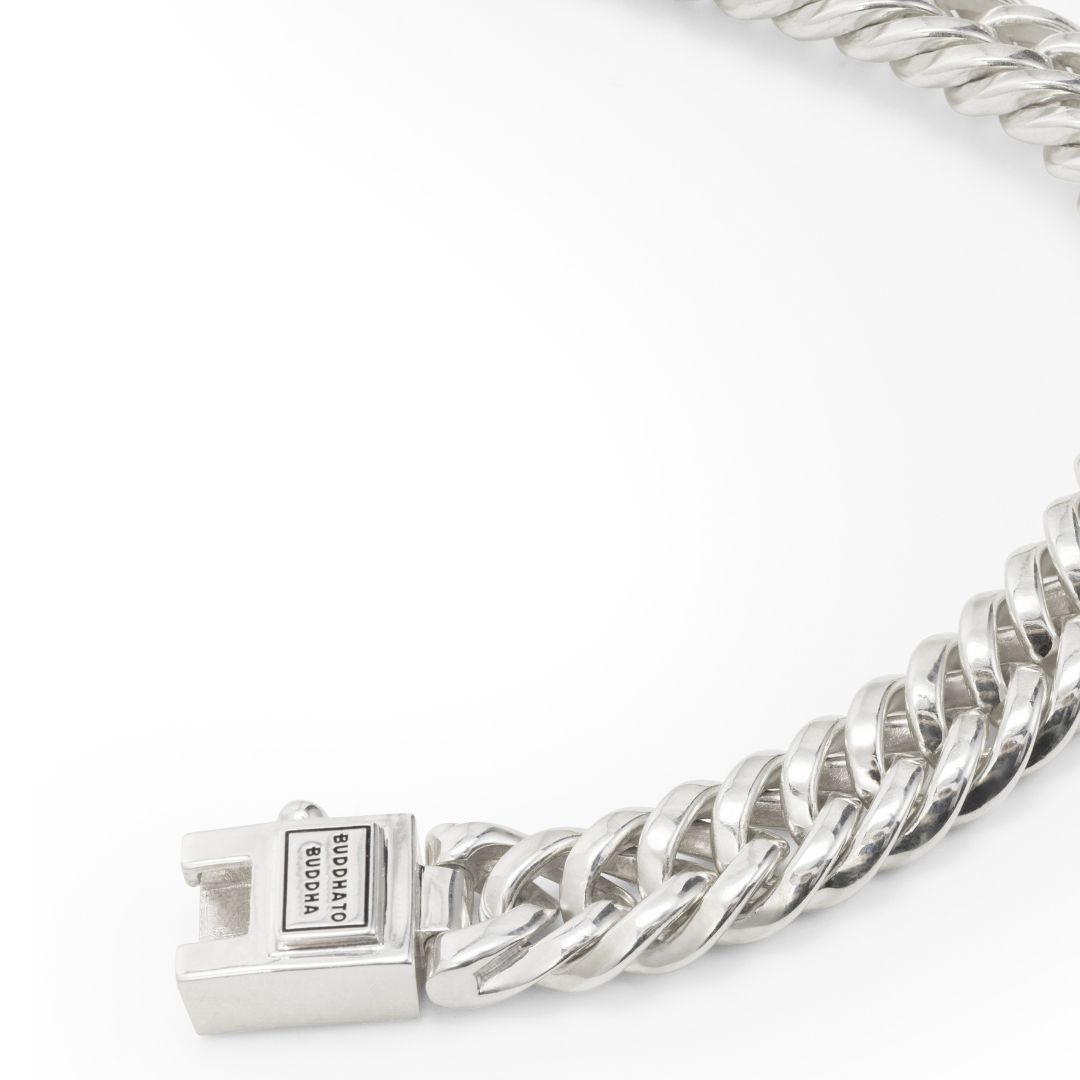 De Chain XS Ketting ontleent zijn inspiratie aan de iconische Chain-vlechttechniek. Met vakmanschap is elke schakel met de hand vervaardigd, wat resulteert in een gedurfde en verfijnde uitstraling. De diepere tinten in het gerecyclede zilver, bereikt door oxidatie, voegen de karakteristieke Buddha to Buddha touch toe aan de ketting.