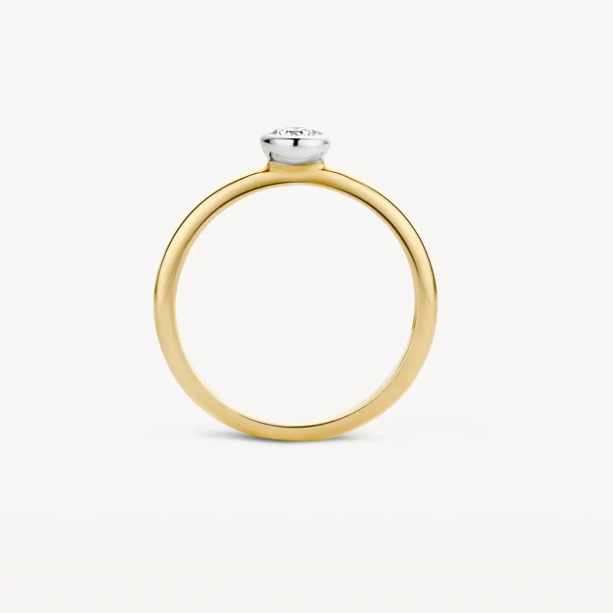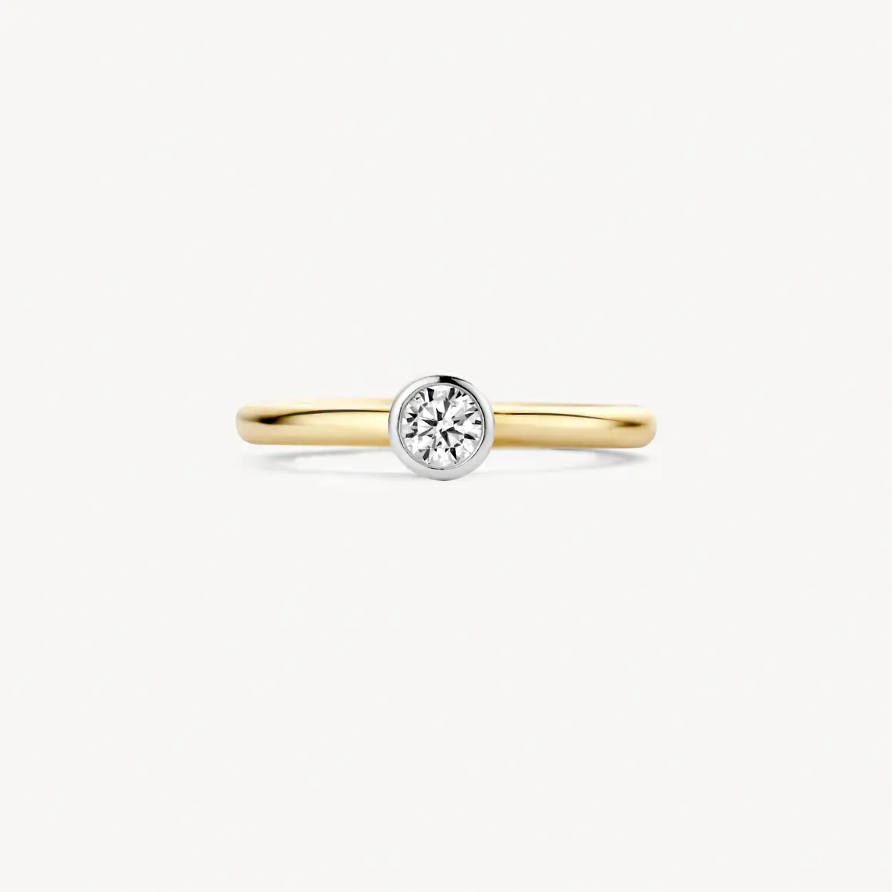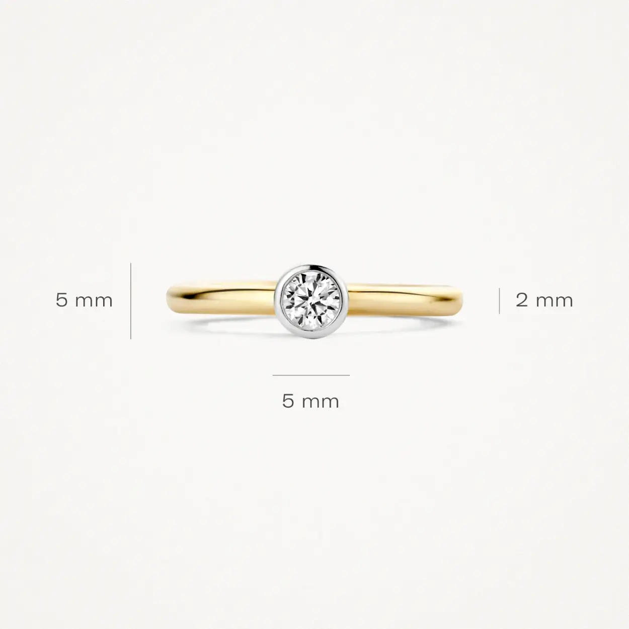 BEen sprankelende zirkonia siert deze elegante ring van 14k wit en geelgoud. De band is 2 mm breed en de steen heeft een doorsnede van 5 mm. Prachtig te combineren met andere geel en witgouden ringen uit onze collectie.