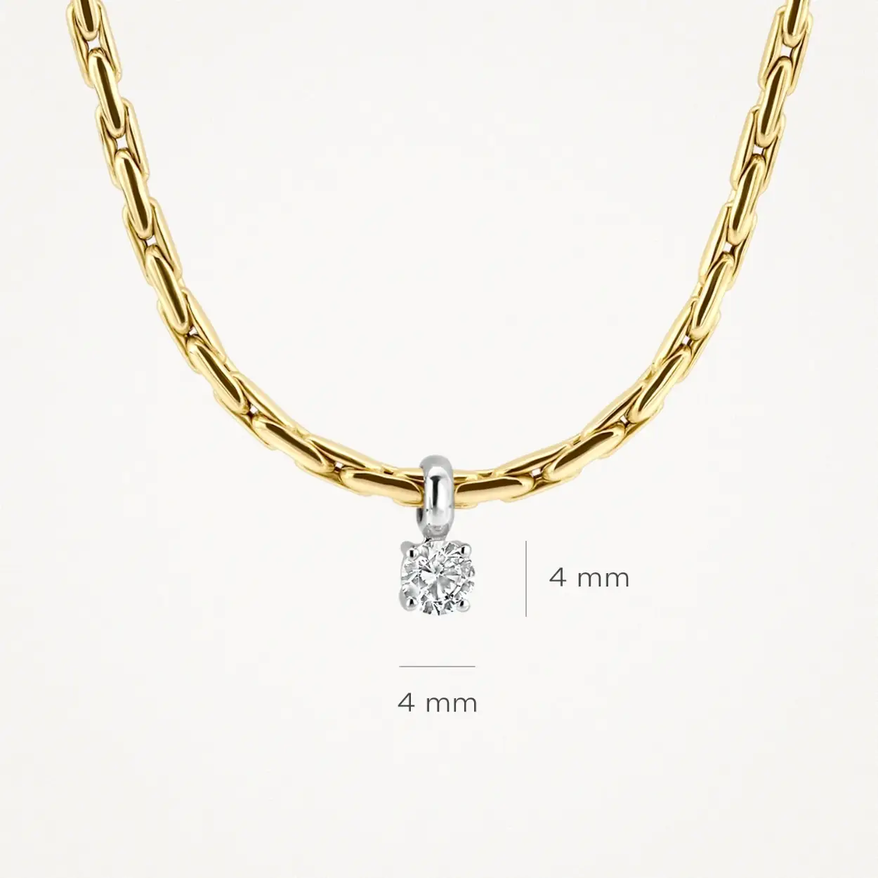 Dit elegante collier heeft fantasieschakels in 14k wit- en geelgoud en een sprankelende hanger met zirkonia. Het heeft een lengte van 42 cm en de hanger een doorsnede van 2,4 mm. Heel mooi op zichzelf maar ook goed te combineren met andere sieraden uit onze collectie.