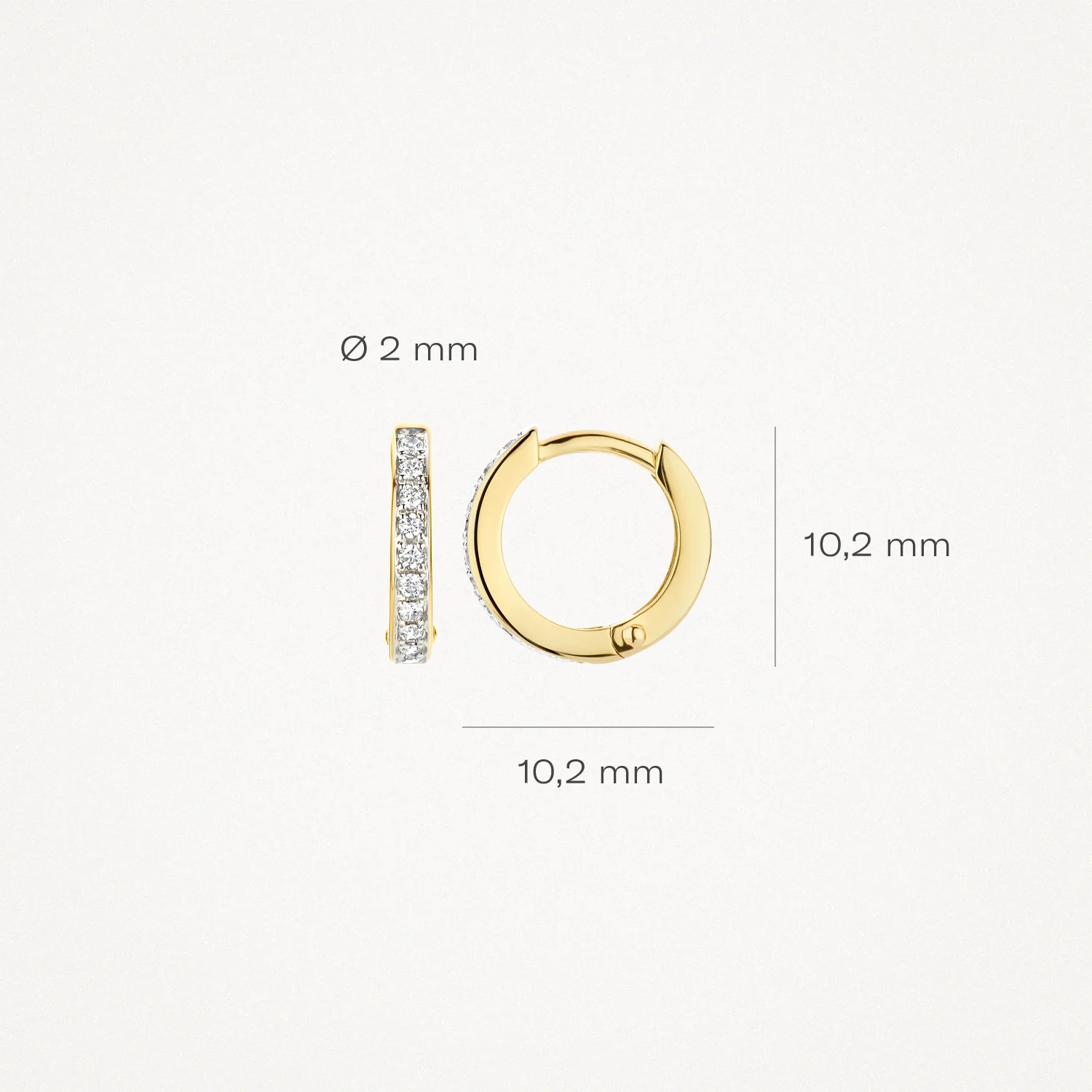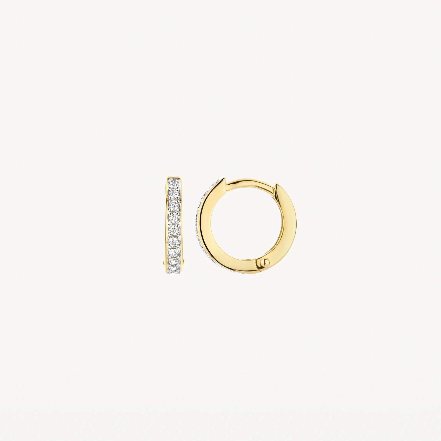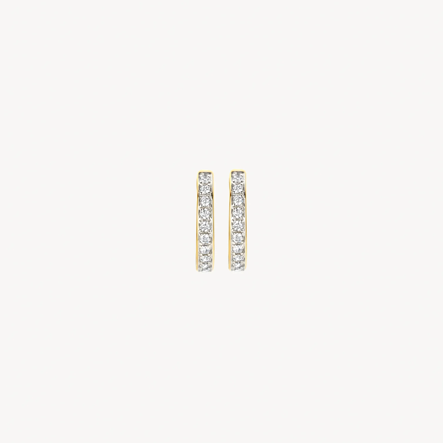 Deze geel gouden oorringen zijn verrijkt met witte briljant geslepen Zirkonia’s aan de voorzijde waardoor de oorbellen een bicolor uitstraling hebben. Draag ze solitair als glanzende blikvangers of gecombineerd met een Zirkonia collier. Ga je voor een glamour look, dan kun je deze oorbellen combineren met onze oorbedels.