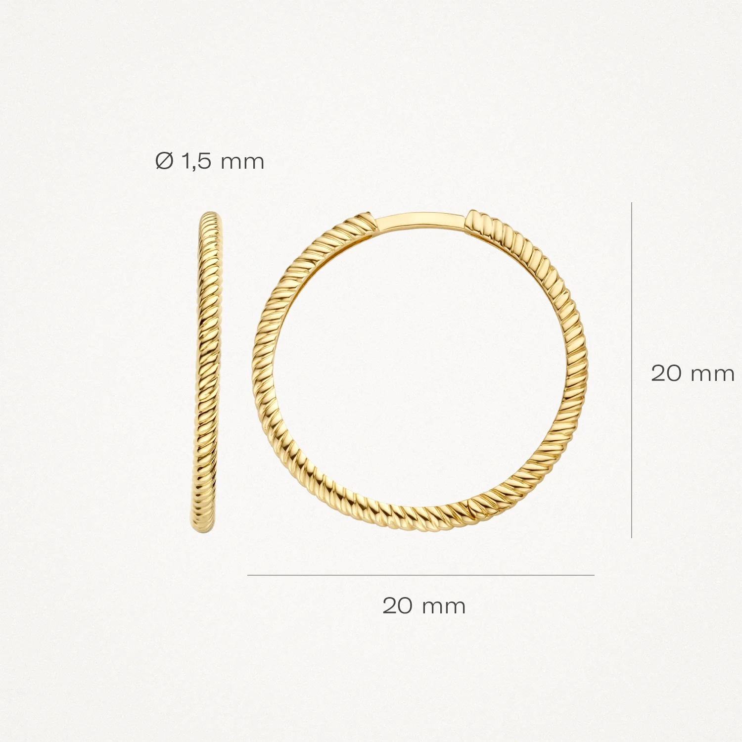 Alsof een gouden draad zich eromheen heeft gewikkeld: dat geeft deze ronde 14k geelgouden oorringen een heel speelse uitstraling. De doorsnede is 20 mm en de oorringen staan prachtig op zichzelf, maar matchen ook mooi met andere (oor)sieraden uit onze collectie.