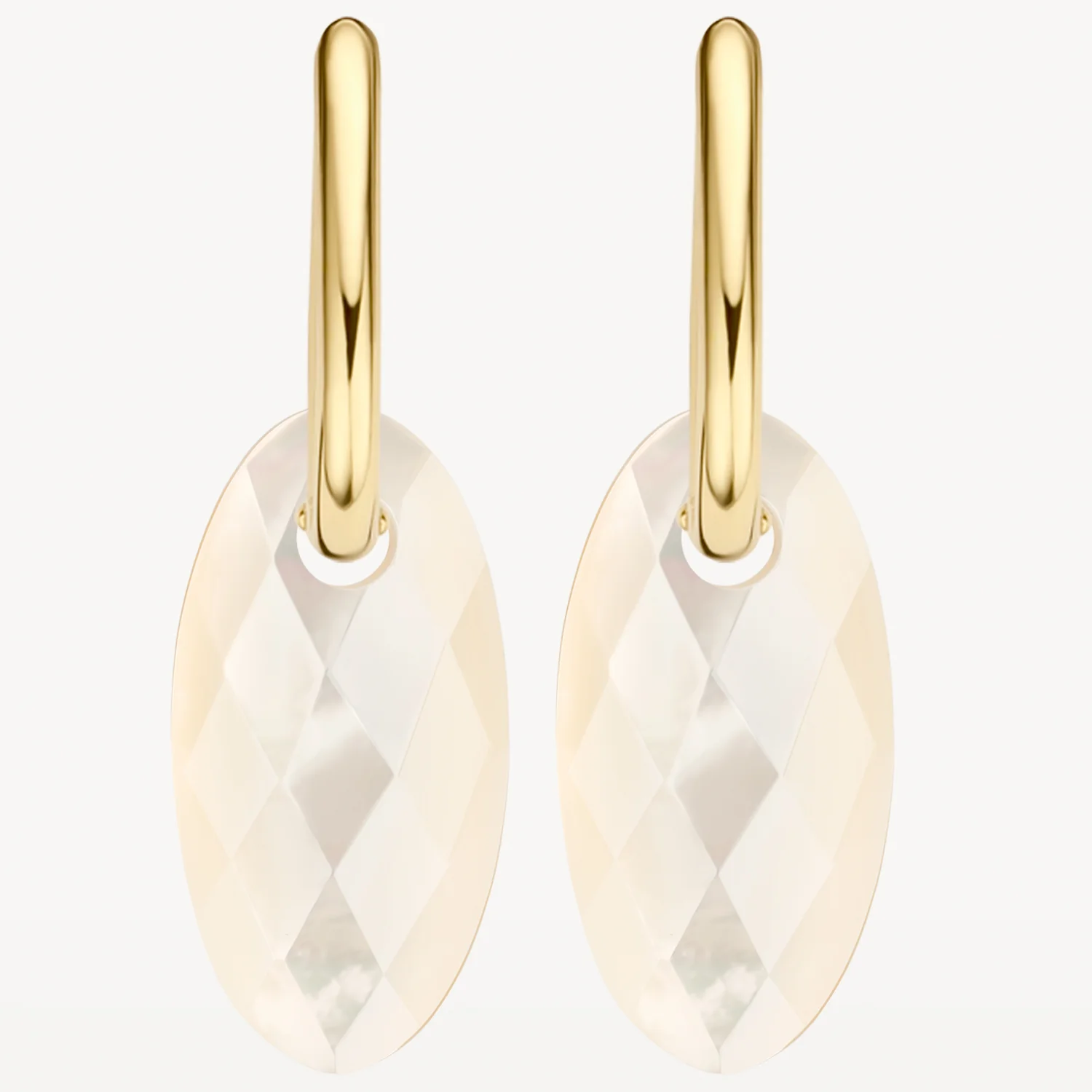 Hou je van speels en stylish? Dan zijn deze natuurstenen oorbedels iets voor jou. De ovaalvormige bedels zijn gemaakt van parelmoer met facetslijpsel. Ze zijn 12 mm hoog en passen om oorringen met maximaal 3 mm doorsnede. Prachtig samen met gouden oorbedels van Blush.