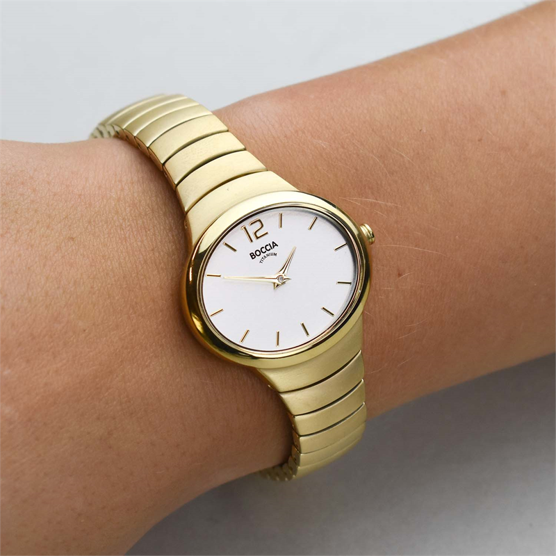 Dit dameshorloge van Boccia Titanium heeft een nette uitstraling. De goudkleurige titanium horlogekast zorgt voor een stijlvolle look en de witte wijzerplaat maakt het horloge chique. Het horloge heeft een ovale kast met een diameter van 30mm, een mineraalglas en is 3ATM. Combineer dit prachtige exemplaar met de andere sieraden van Boccia Titanium voor een complete look. Aan de titanium kast zit een goudkleurige schakelband.