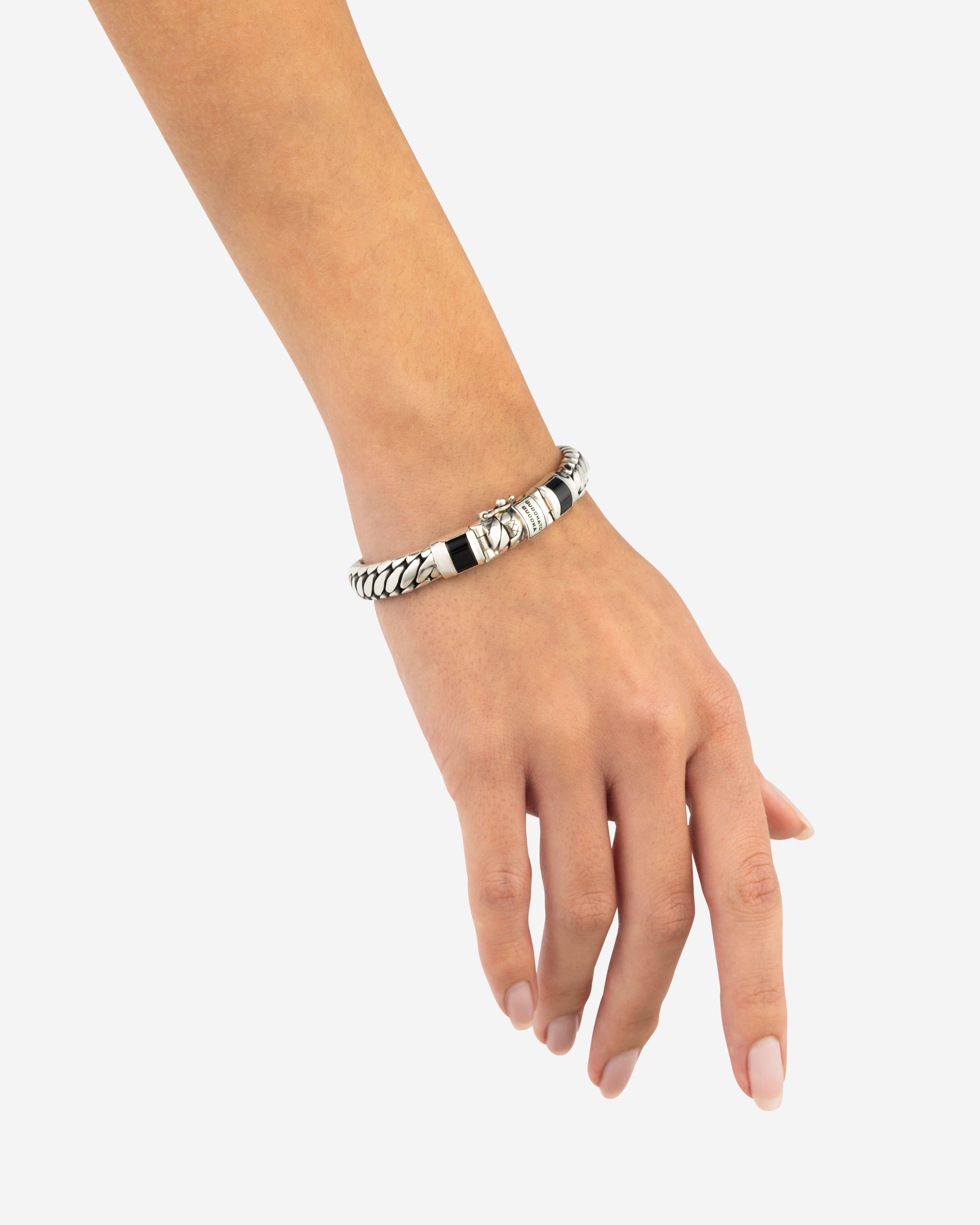 De Ben XS Onyx Armband is een perfecte combinatie van vakmanschap en de kracht van de natuur. Deze armband, met zijn krachtige Ben design, is verrijkt met de mystieke Onyx steen, bekend om zijn beschermende eigenschappen. De Onyx steen staat ook symbool voor innerlijke kracht, uithoudingsvermogen en focus. Elk detail van deze armband is zorgvuldig handgemaakt uit gerecycled 925 zilver. Draag het als een symbool van jouw innerlijke kracht en de sterke connecties die je in het leven maakt. Wij geloven dat ieder sieraad een eigen ziel heeft, wat betekent dat voor jou?