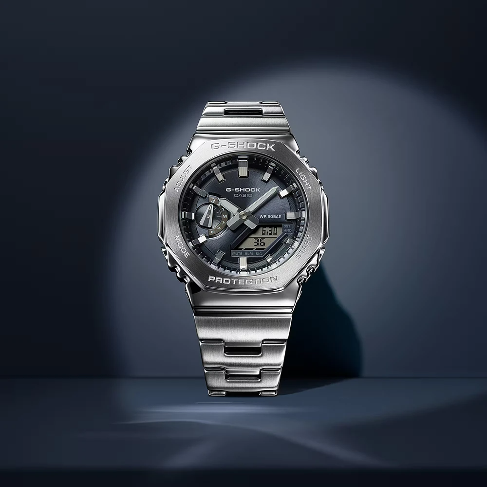 Casio G-Shock heren horloge zilver blauw 49,3 mm analoog-digitaal 20 ATM | GM-2110D-8AER — robuust zilvergrijs sporthorloge met metalen edelstalen kast en band, schokbestendige constructie en multifunctionele functies. Elegant, sportief en klaar voor dagelijks gebruik of avontuur. Verkrijgbaar bij Juwelier Schouten – Middenwaard, Heerhugowaard.