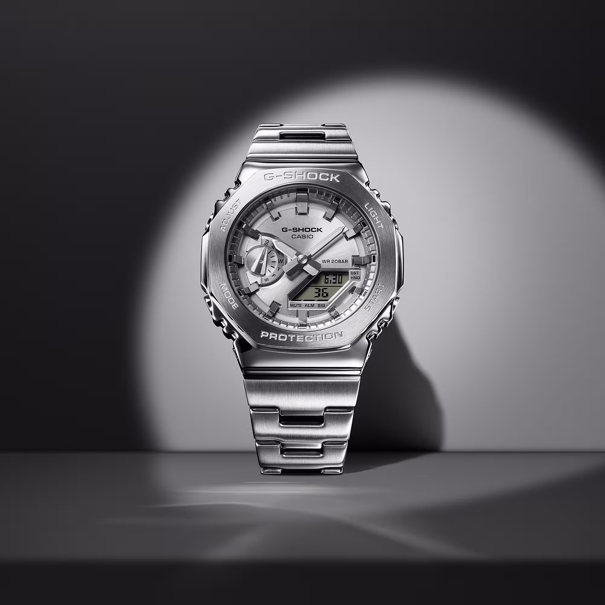 Maak kennis met de GM-2110D, een analoog-digitale combinatie van G-STEEL op basis van de GA-2100, nu met een stijlvolle update van de metalen rand en band.