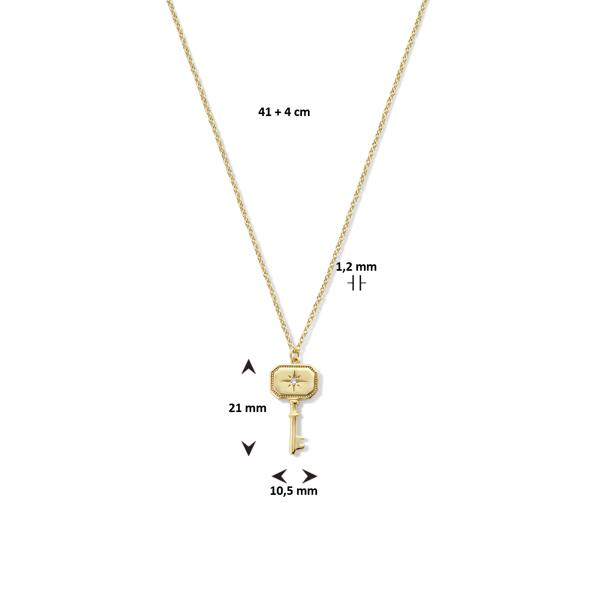 Geelgoud op 925 zilveren collier uitgevoerd met een sleutel en een karabijn sluiting. Het collier heeft een draaglengte van 41cm met een extensie van 4cm. Geen garantie op de plating.