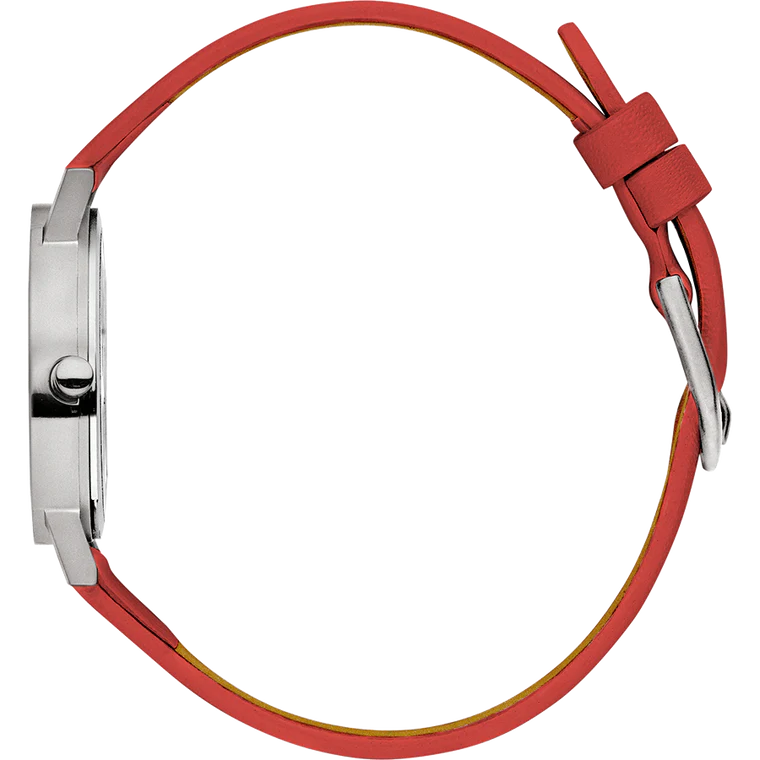 Danish Design Rhine titanium dameshorloge IV19Q199 met quartz uurwerk, witte wijzerplaat, rode leren band, mineraalglas en waterbestendigheid tot 3 ATM. Verkrijgbaar bij Juwelier Schouten – Middenwaard, Heerhugowaard.