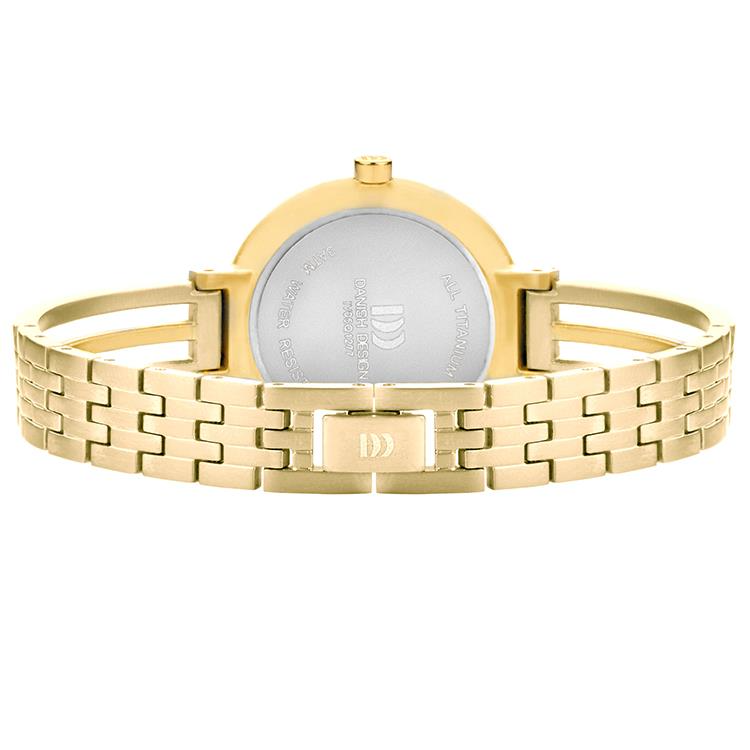 Danish Design Tiara Gold titanium dameshorloge IV05Q1277 met quartz uurwerk, vergulde titanium kast Ø 30 mm, zilverkleurige wijzerplaat, mineraalglas en spatwaterdichtheid tot 3 ATM. Verkrijgbaar bij Juwelier Schouten – Middenwaard, Heerhugowaard.