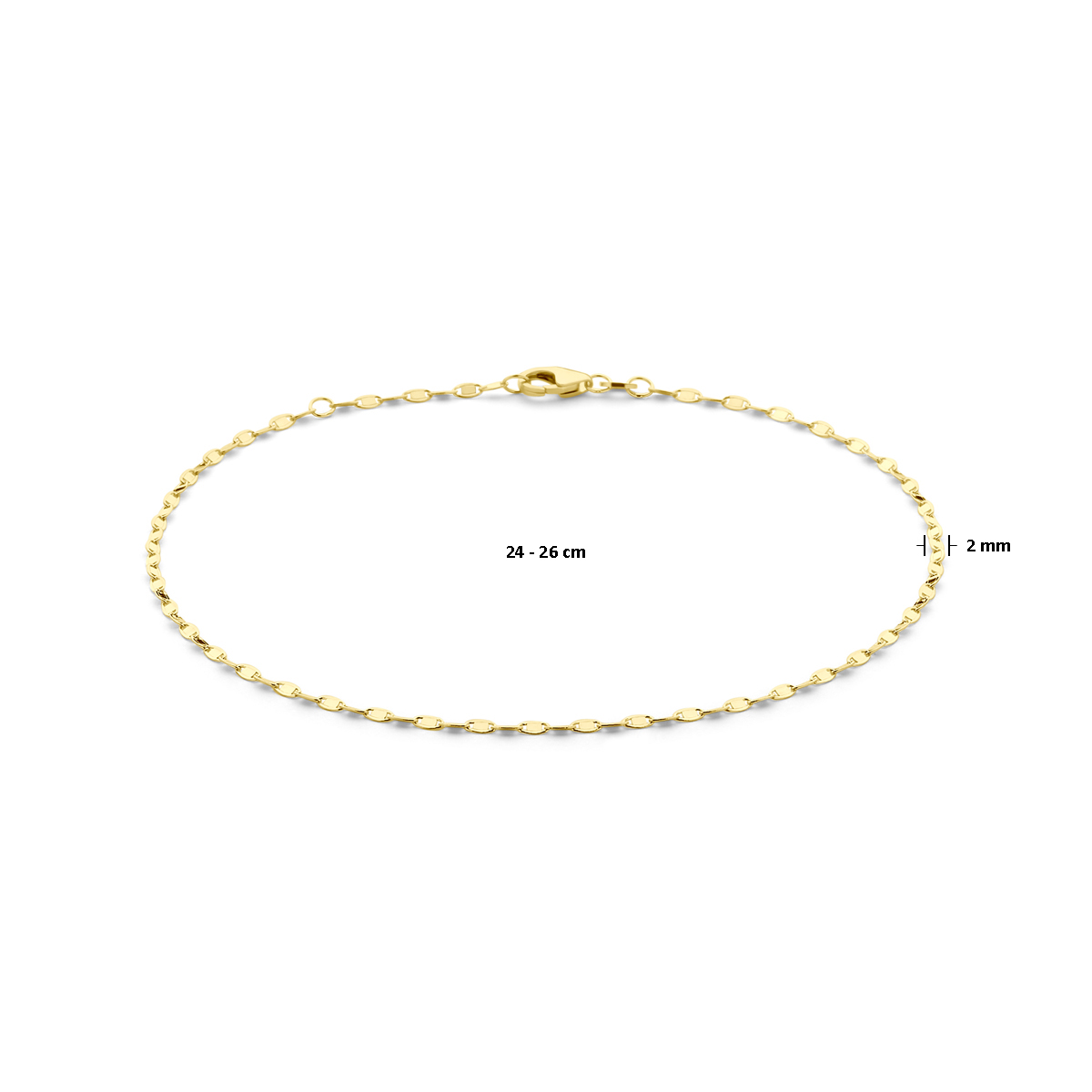 Geelgouden enkelbandje met een draaglengte van 24cm met een extensie van 2cm. De schakelbreedte is 2.0mm. De armband is uitgevoerd met een stevige karabijn sluiting.