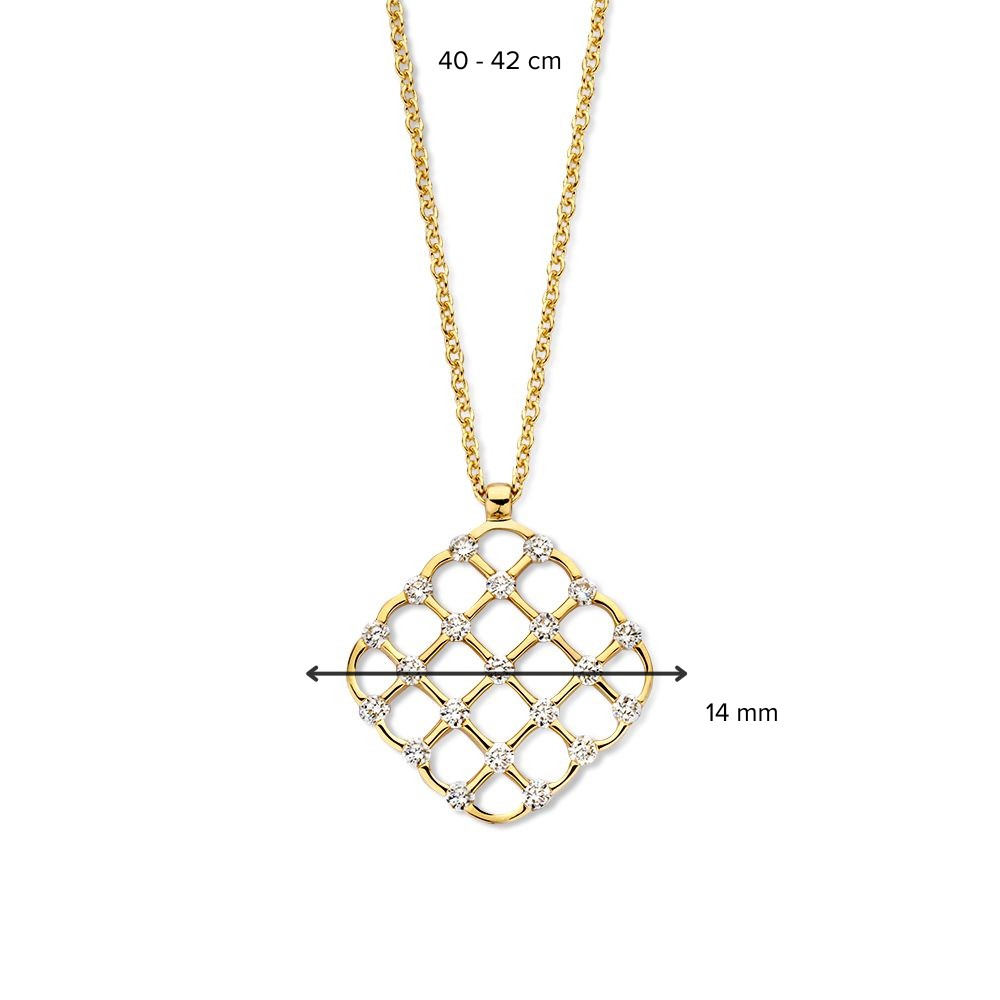 De Excellent briljant collier CP117657 is een elegante geelgouden halsketting met een gewicht van 2 gram en een breedte van 14 mm. Het bevat een schitterende, witte briljantgeslepen diamant van 0.22 karaat, zuiverheid SI1, gemaakt van 14-karaats goud. Perfect voor speciale gelegenheden om je outfit te verfraaien. Draag het alleen of combineer met andere sieraden voor een verleidelijke look.