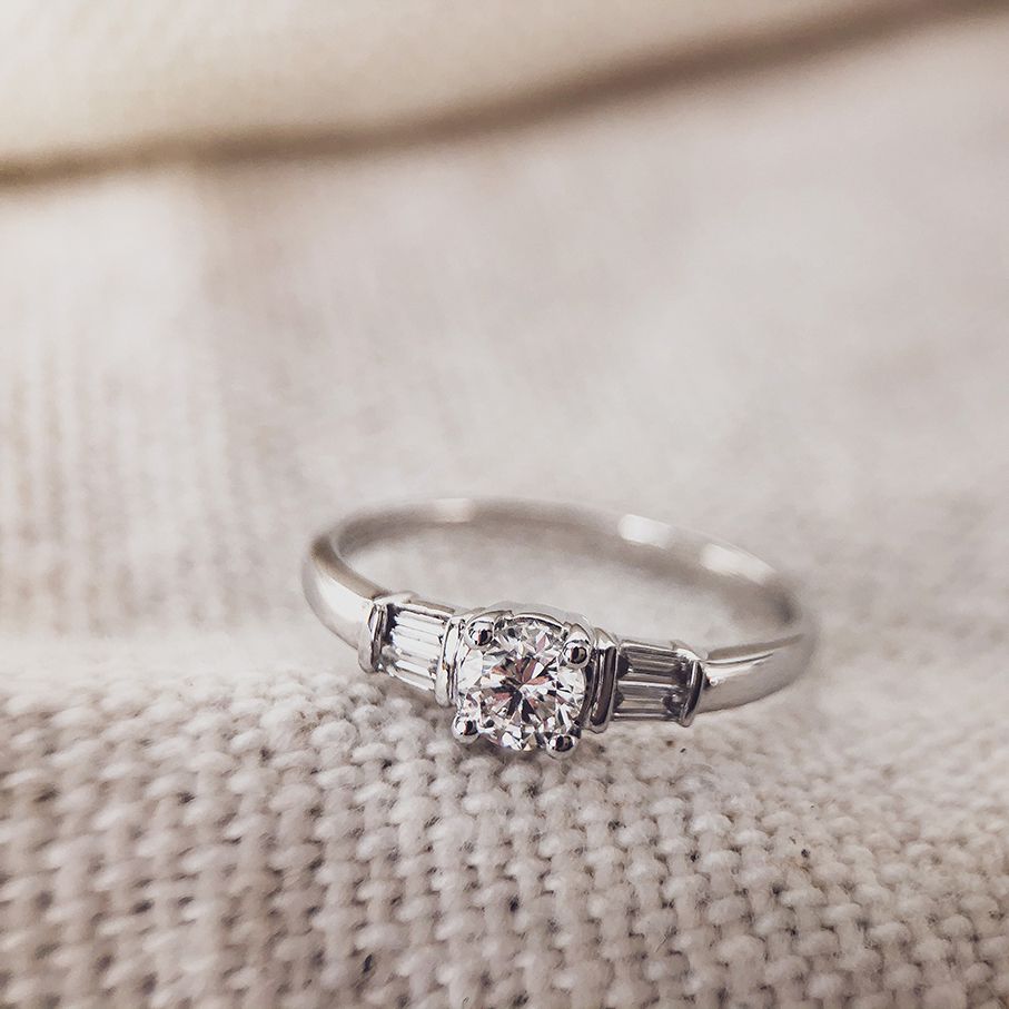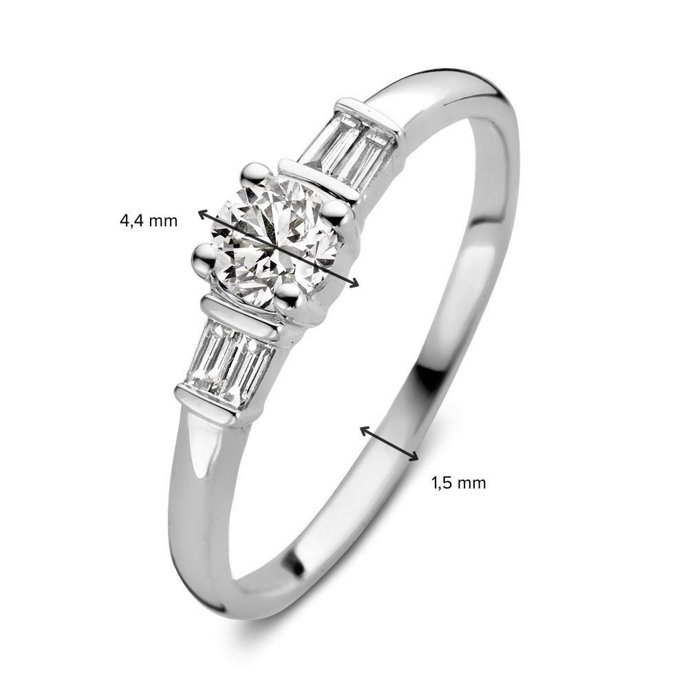 Witgouden damesring met briljant geslepen middensteen en aan weerzijde 2x baguette geslepen diamanten als stralende zijstenen.