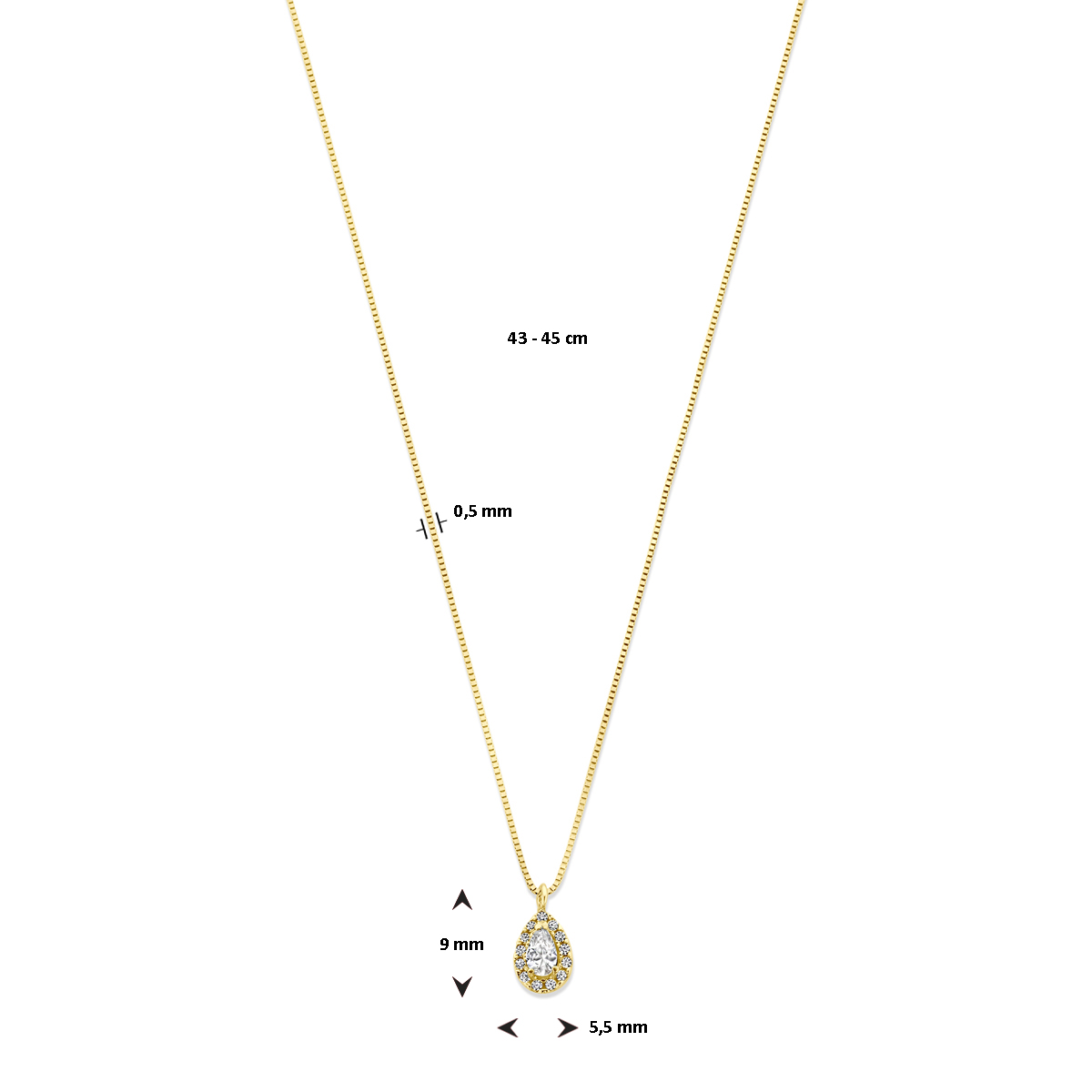 14k Geelgouden collier uitgevoerd met een druppel en zirkonia. Het collier heeft draaglengtes van 43-45cm.