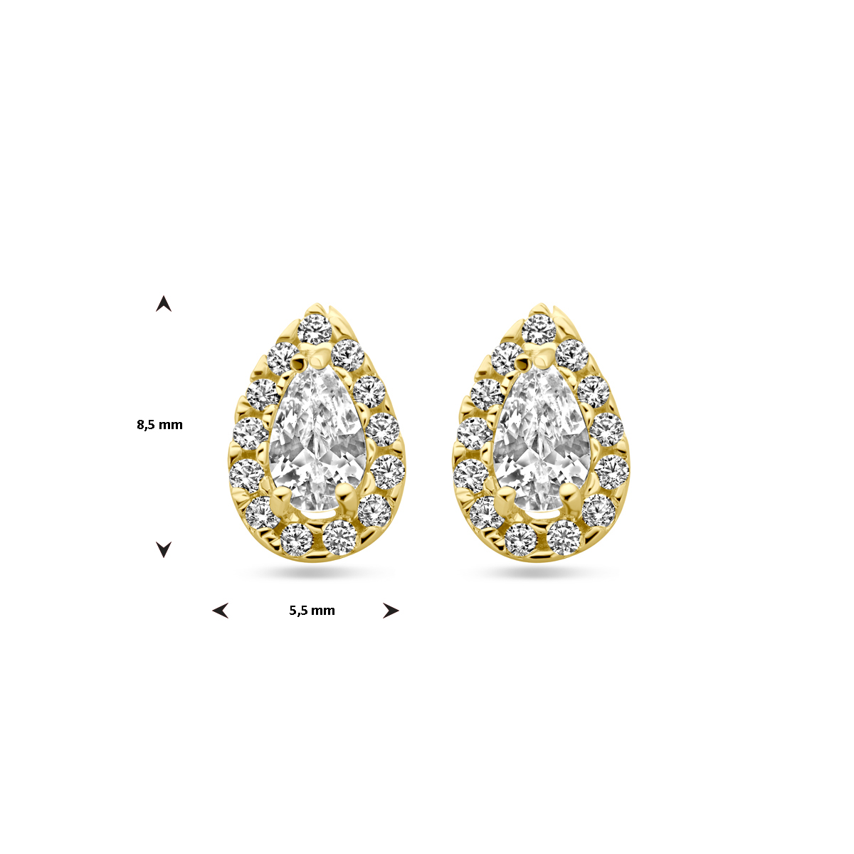 14k Geelgouden oorknoppen uitgevoerd met zirkonia. De oorknoppen hebben een afmeting van 8.5x5.5mm.