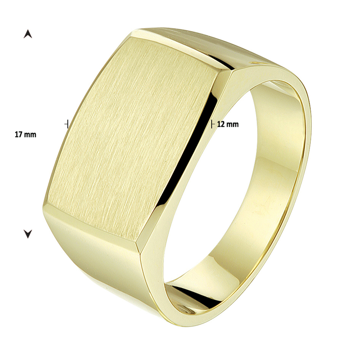 Stijlvolle geelgouden massieve graveerring met een afmeting van 12x17mm. De gediamanteerde afwerking en de robuuste afkantingen maken de ring helemaal af. De ring geeft je look direct een chique uitstraling.