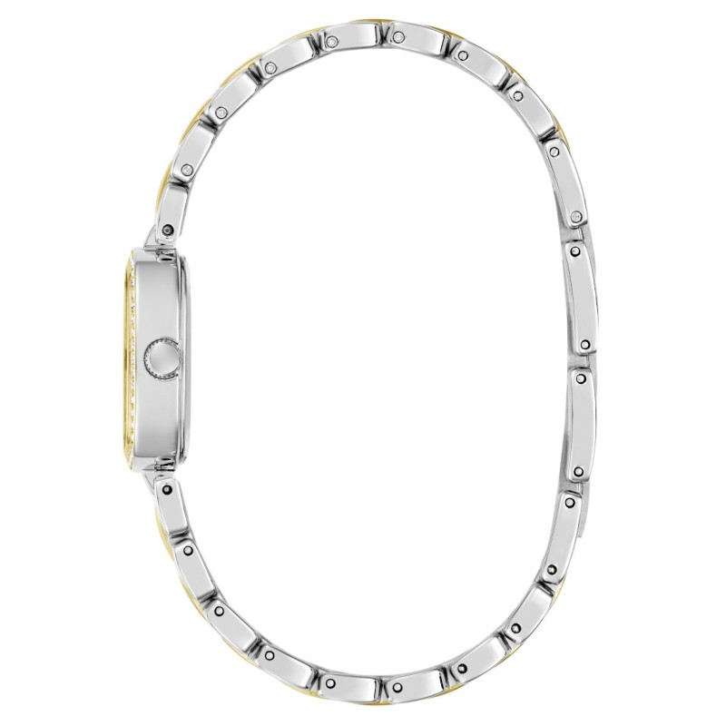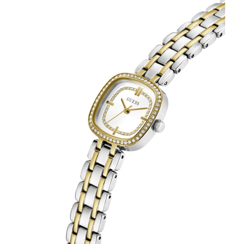 Het GUESS HAZEL dameshorloge heeft een verfijnde witte wijzerplaat, omlijst door fonkelende kristallen.