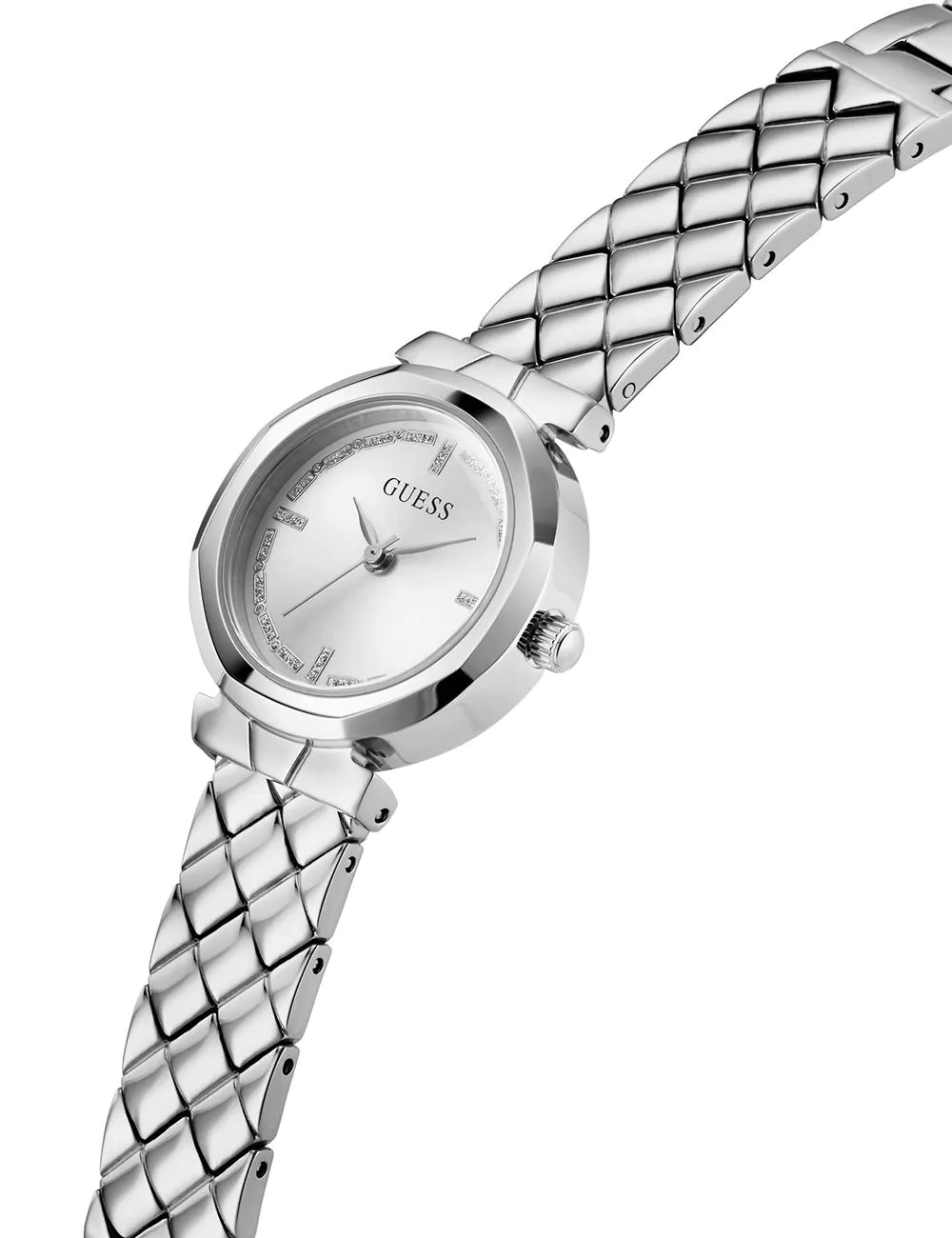 Het Guess Mini Rumour dameshorloge GW0839L4 is een stijlvol model dat de aandacht trekt. De kast en band zijn gemaakt van edelstaal, heeft een zilveren kleur en een breedte van 26 mm. De wijzerplaat, in dezelfde tint, is bedekt met mineraal glas. De roestvrijstalen armband in zilverkleur vult het geheel perfect aan en creëert een samenhangende compositie. Het horloge is uitgerust met een quartz uurwerk en heeft een waterbestendigheid tot 30 meter, waardoor het bestand is tegen kleine spatten, zoals bij het handen wassen.