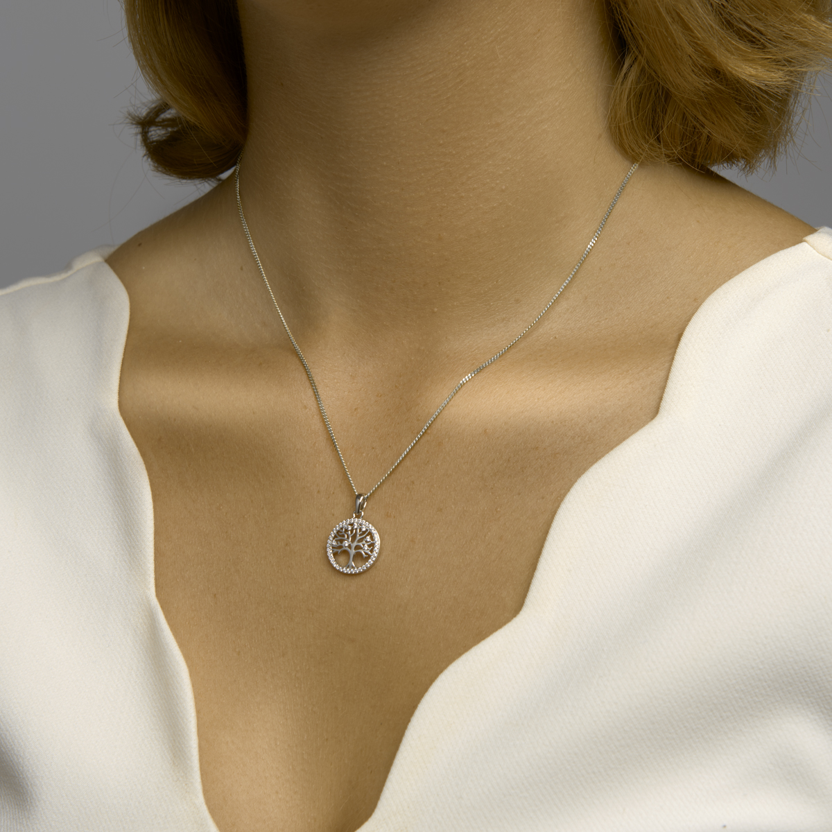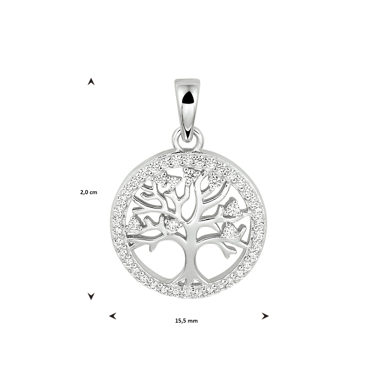 Gerhodineerd 925 zilveren hanger uitgevoerd met een levensboom en schitterend zirkonia. De hanger heeft een totale hoogte van 20 mm en een diameter van 15,5mm.