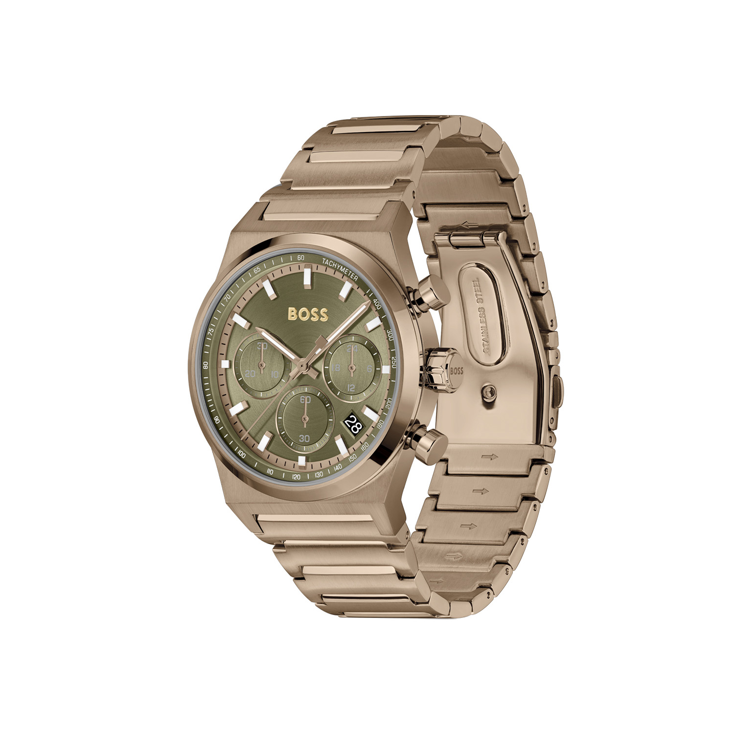 Hugo Boss Candor Chrono heren horloge 41 mm goud-groen | HB1514222 — stijlvol en sportief chronograafhorloge met groene wijzerplaat, goudkleurige roestvrijstalen kast en band. Elegant design met quartz uurwerk en datum- en chronofuncties. Verkrijgbaar bij Juwelier Schouten – Middenwaard, Heerhugowaard.