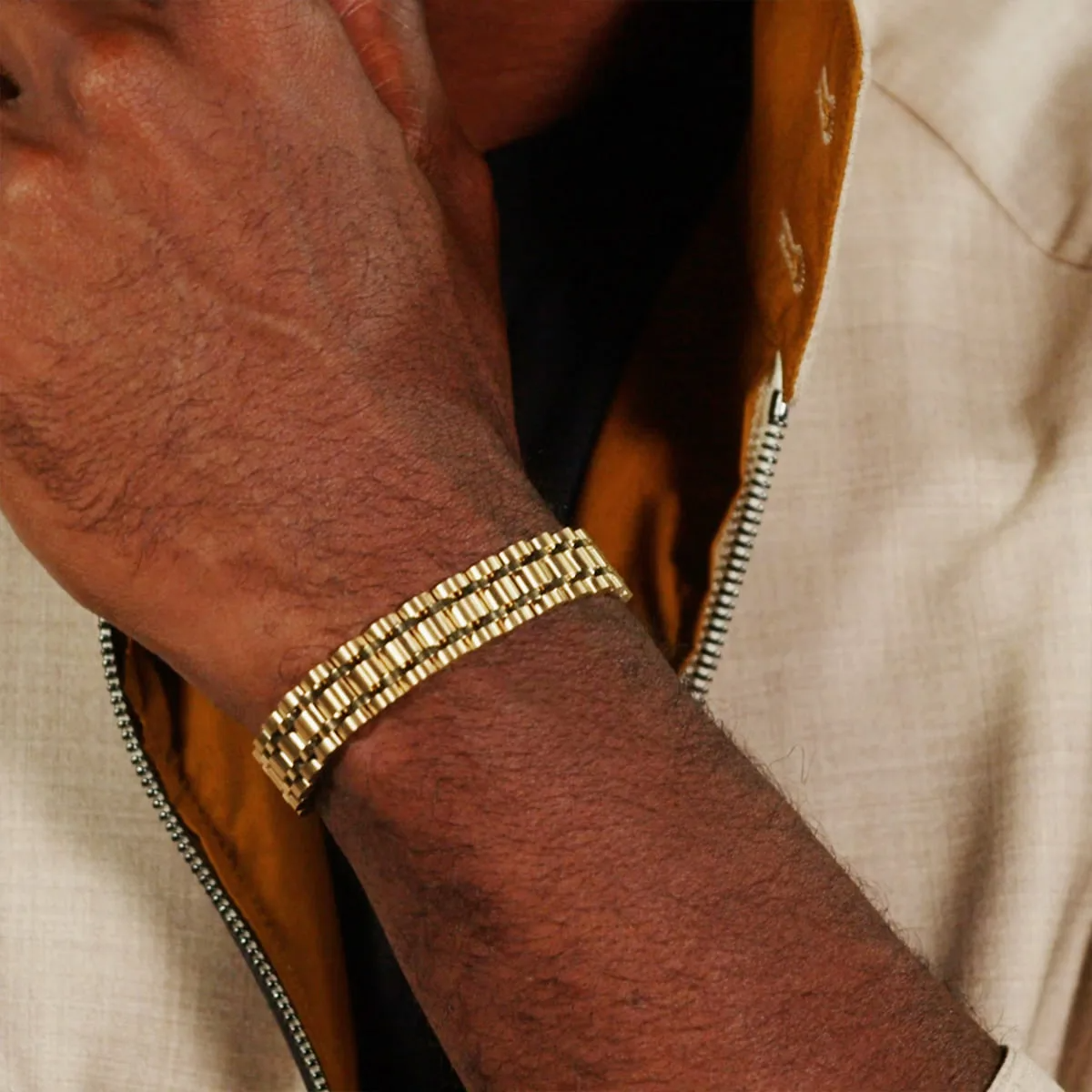 Vergulde herenarmband van Hugo Boss, gemaakt van hoogwaardig roestvrij staal. Lengte: 19 cm. Slank design met luxe afwerking. Verkrijgbaar bij Juwelier Schouten – Middenwaard, Heerhugowaard.