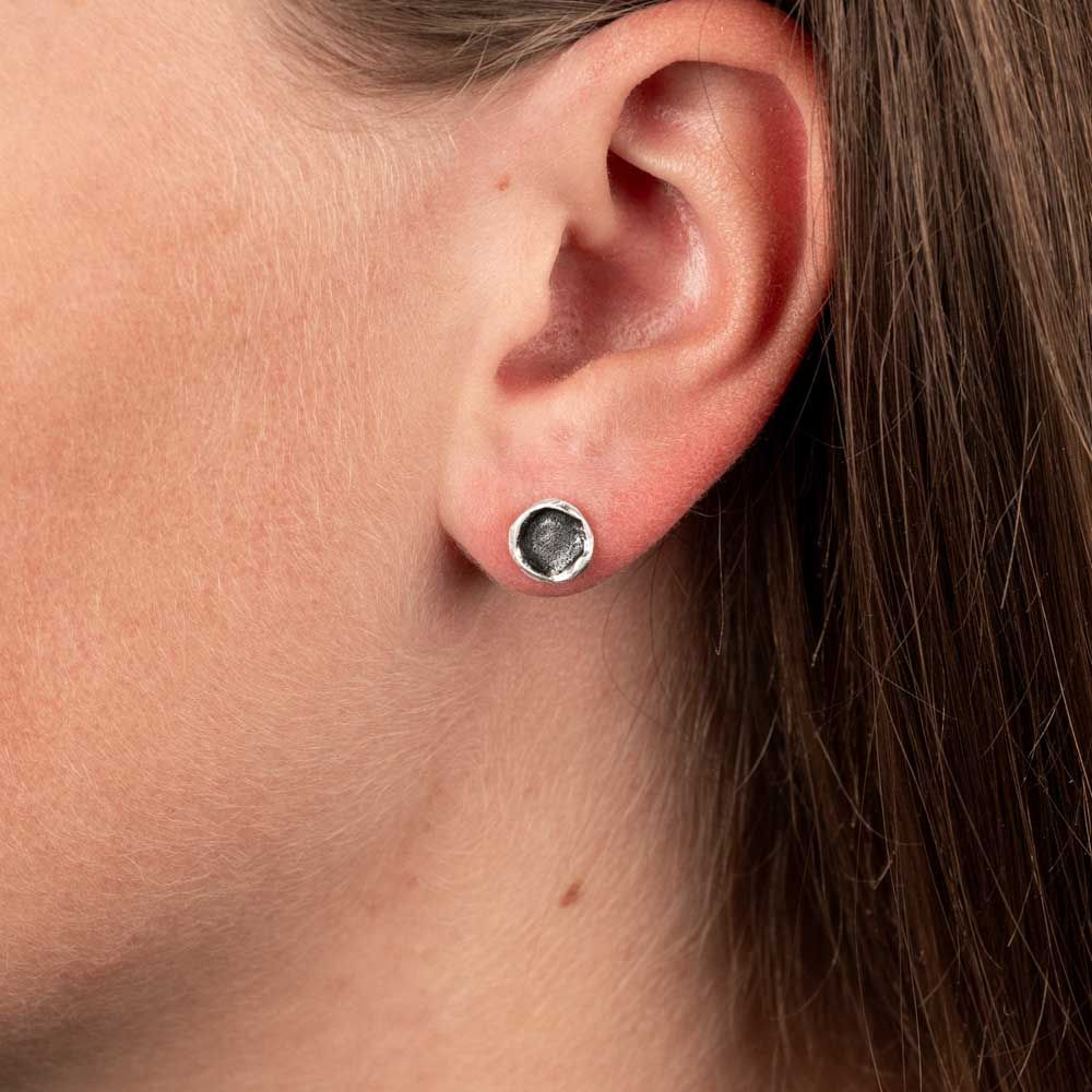Oorknopjes gemaakt van 925 sterling zilver en geoxideerd zilver de oorknop heeft een ronde organische vorm. De randen van de oorstekers staan omhoog voor meer diepte.