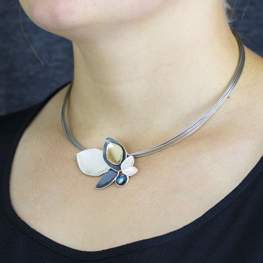 Hanger gemaakt van 925 sterling zilver, geoxideerd zilver en zilver verguld uit de collectie van Jéh Jewels. Deze bladvormige hanger, met labradoriet is prachtig aan een staaldraad spang. Labradoriet is een sterk beschermende en spirituele steen. Het beschermt het eigen energieveld (aura) tegen negatieve invloeden uit de omgeving.