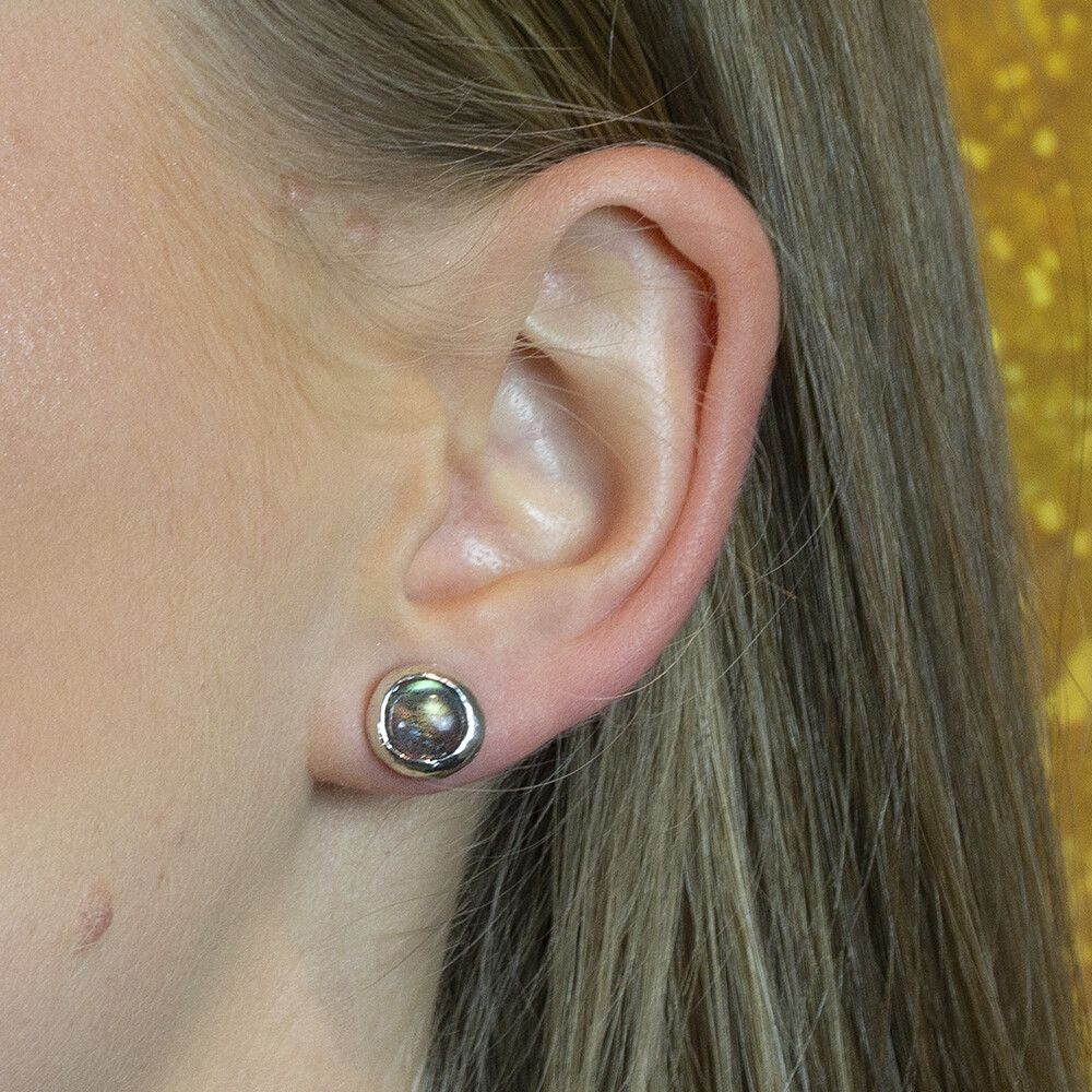 Oorknop gemaakt van 925 sterling oxy shiny zilver, oxy shiny is zilver wat is geoxideerd en daana weer gepoleisd. Hierdoos blijft het zilver kleurvast. In de de oorbel zit de edelsteen Labradoriet. Labradoriet is een sterk beschermende en spirituele steen. Als je de oorbel beweegt, zie je de regenboog kleuren tevoorschijn komen van deze prachtige steen.