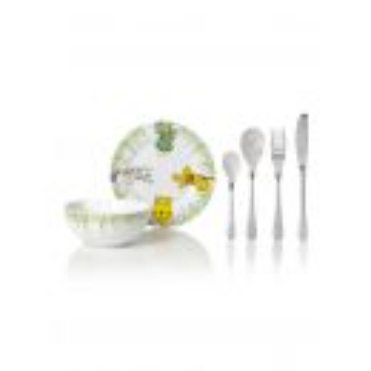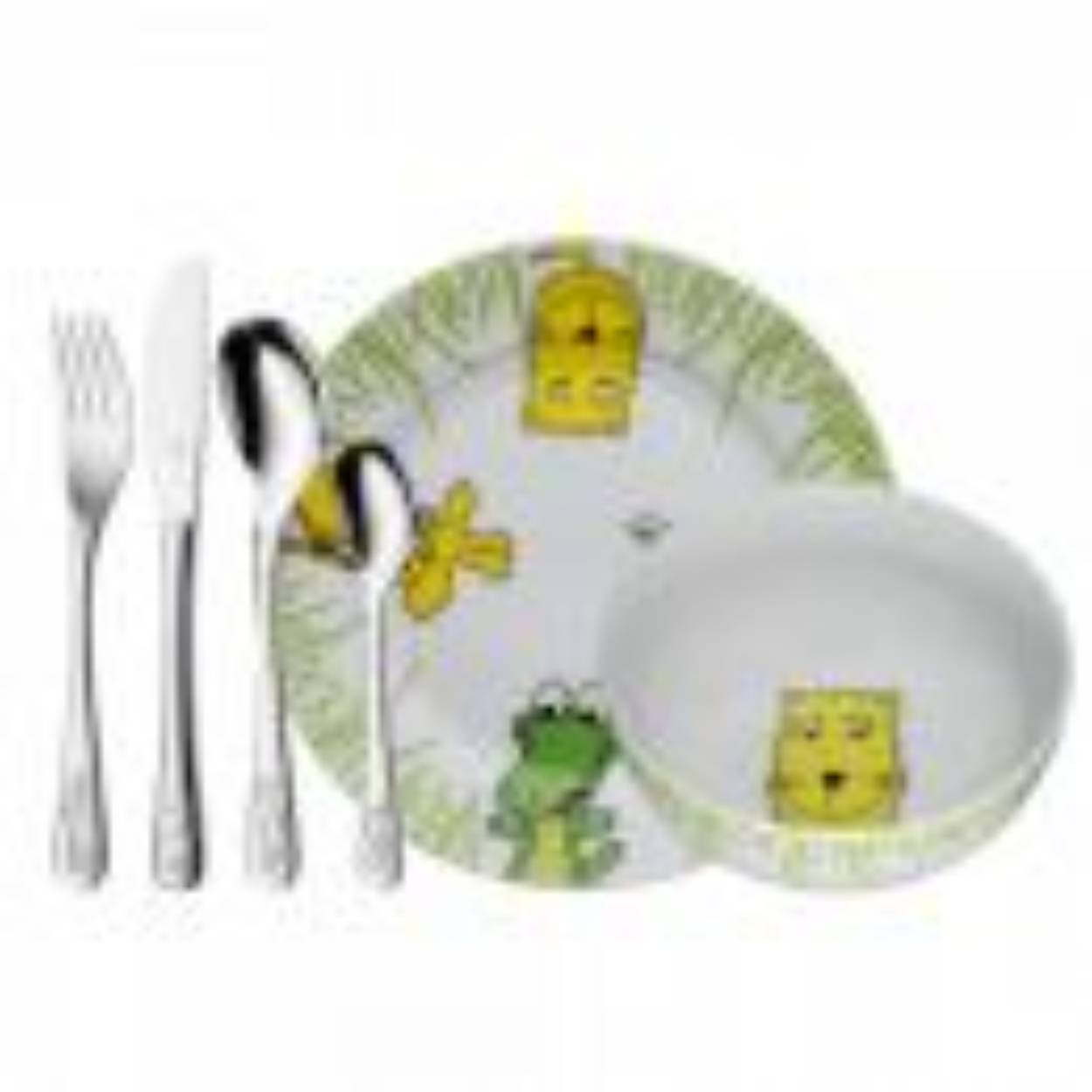 Afmetingen servies: Diameter kinderbord: 19 cm., kinderschaaltje: 14 cm. Afmetingen bestek: kindervork: 16,5 cm., kinderlepel: 17 cm., kindermes: 18,5 cm. en eetlepel: 13 cm.