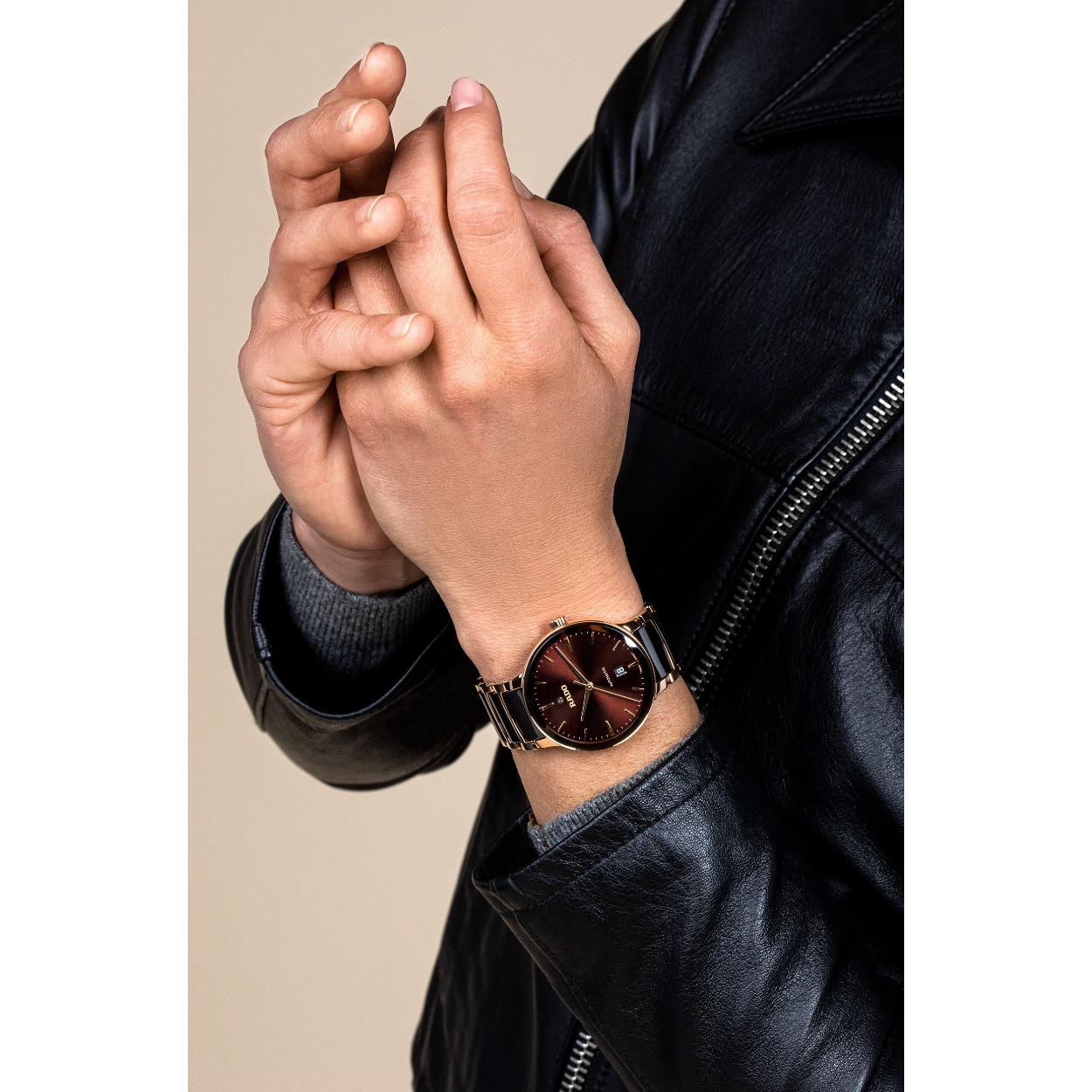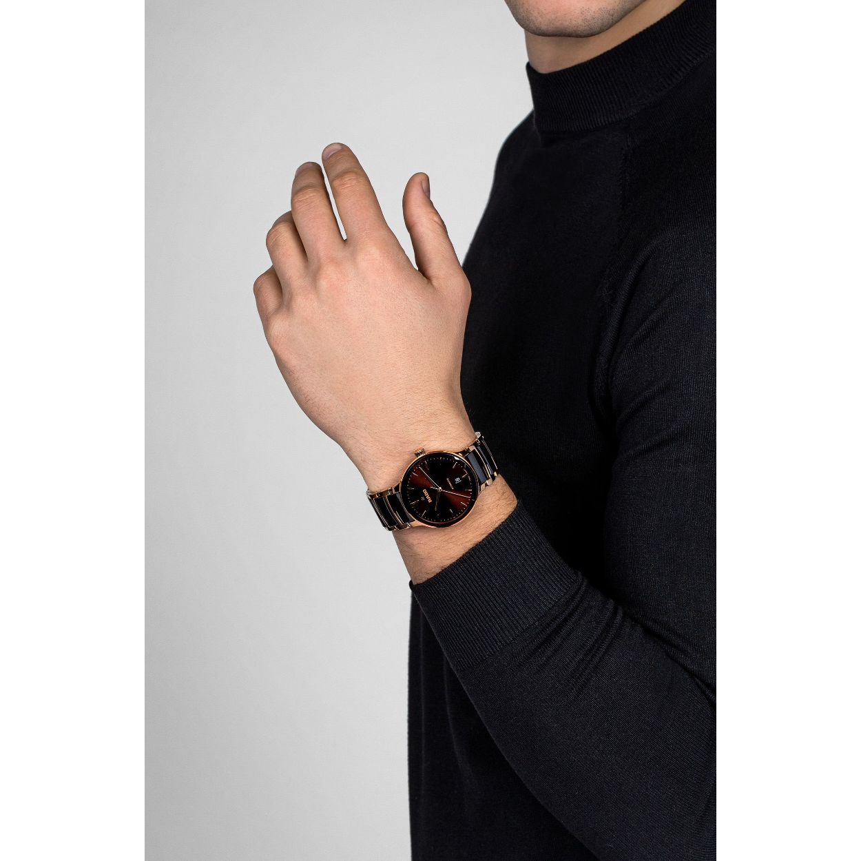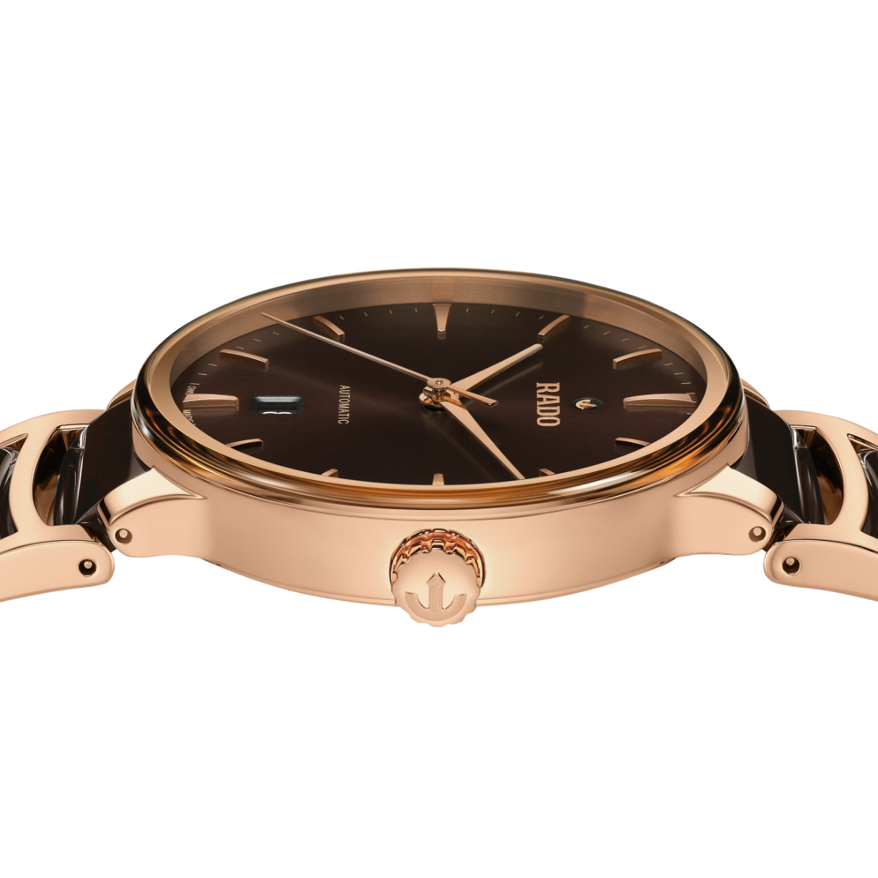 De klassieke Centrix Automatic is niet alleen technisch, maar ook esthetisch herwerkt. Het aangepaste model heeft een afgerond saffierglas dat helemaal doorloopt tot aan de rand en een gebogen kast die overgaat in de gebogen kristalrand. Het algehele uiterlijk van dit iconische uurwerk wordt gecompleteerd met aangepaste kastaanzetten en een armband van gepolijst roségoudkleurig PVD-gecoat roestvrij staal met bruine hightech keramische middenschakels. De bruine sunray wijzerplaat met roségoudkleurige opgelegde indexen matcht perfect met de roségoudkleurige wijzers. Binnenin overtreft het driehandige kaliber R763-uurwerk de standaard nauwkeurigheidstestvereisten van 3 tot 5 posities, dankzij de antimagnetische Nivachron™-spiraalveer voor verhoogde betrouwbaarheid en nauwkeurigheid. Het horloge is waterdicht tot 50 meter en biedt 80 uur gangreserve.