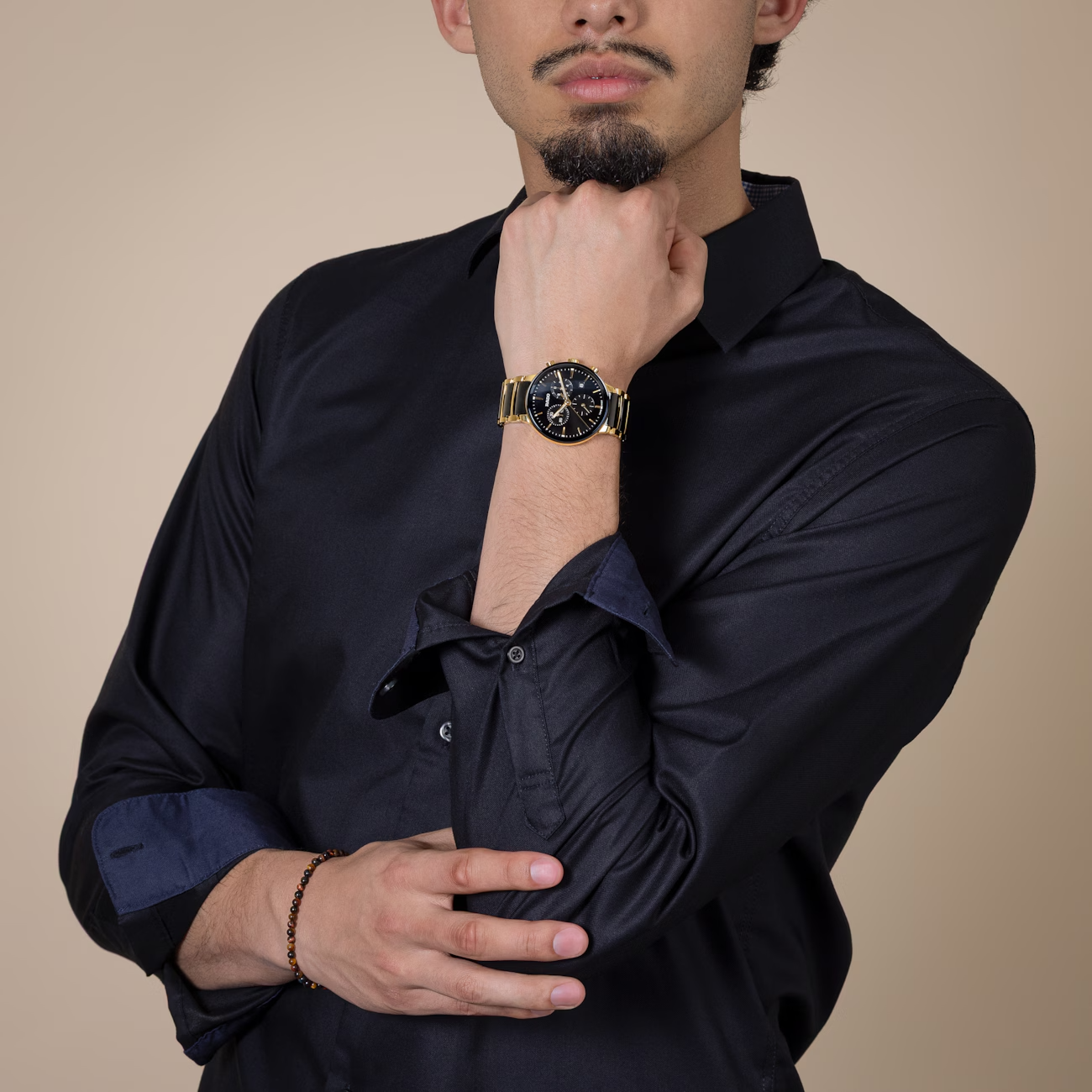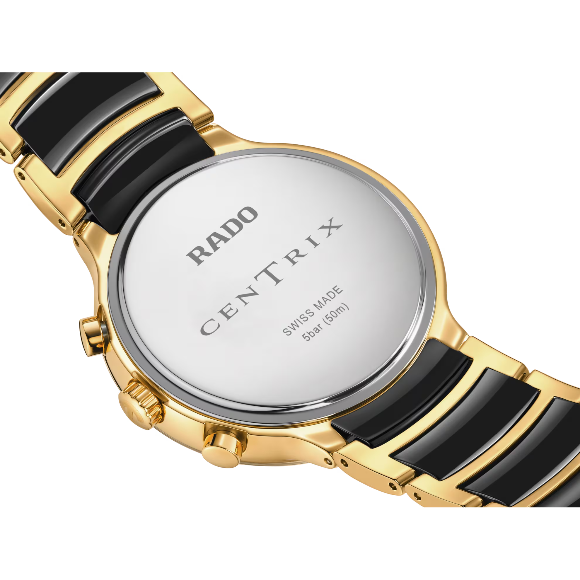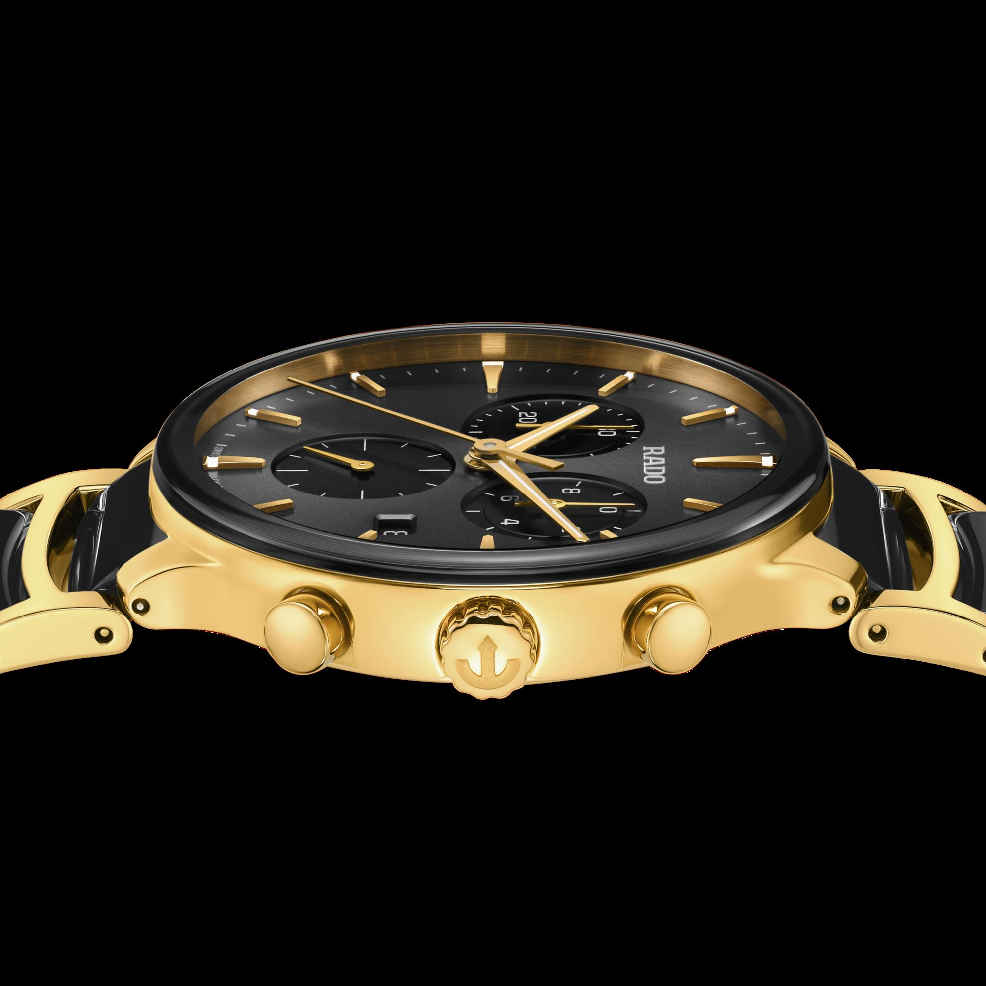 Ervaar de harmonieuze mix van artistieke expressie en verfijnd design met de Centrix Chronograaf. De 41 mm kast is vervaardigd uit roestvrij staal en voorzien van een geelgouden PVD-coating. De kast is bekroond met gebogen saffierglas met een antireflectiecoating aan beide zijden, voor een onberispelijke afleesbaarheid. De Calibre R312 quartzchronograaf zet een nieuwe standaard in precisie. Uitgerust met 22 juwelen en een configuratie met zes wijzers, integreert dit uurwerk Precidrive- en Heavydrive-technologieën voor een onwrikbare nauwkeurigheid van +/- 10 seconden per jaar. De zwarte sunray-wijzerplaat, versterkt door geelgouden indexen met witte Super LumiNova®, straalt verfijnde verfijning uit. Drie zorgvuldig geplaatste tellers omvatten een 30-minutenteller, een tiende-seconde-tracker met nauwkeurige chronograaffunctionaliteit en een kleine secondewijzer op 6 uur. Het discrete datumvenster op vier uur voegt een vleugje praktische elegantie toe. Het algehele uiterlijk van dit iconische horloge wordt gecompleteerd door elegant afgestelde kastaanzetten en een band van gepolijst roestvrij staal met een geelgouden PVD-coating en zwarte hightech keramische middenschakels, vastgezet met een drievoudige sluiting van geborsteld roestvrij staal.