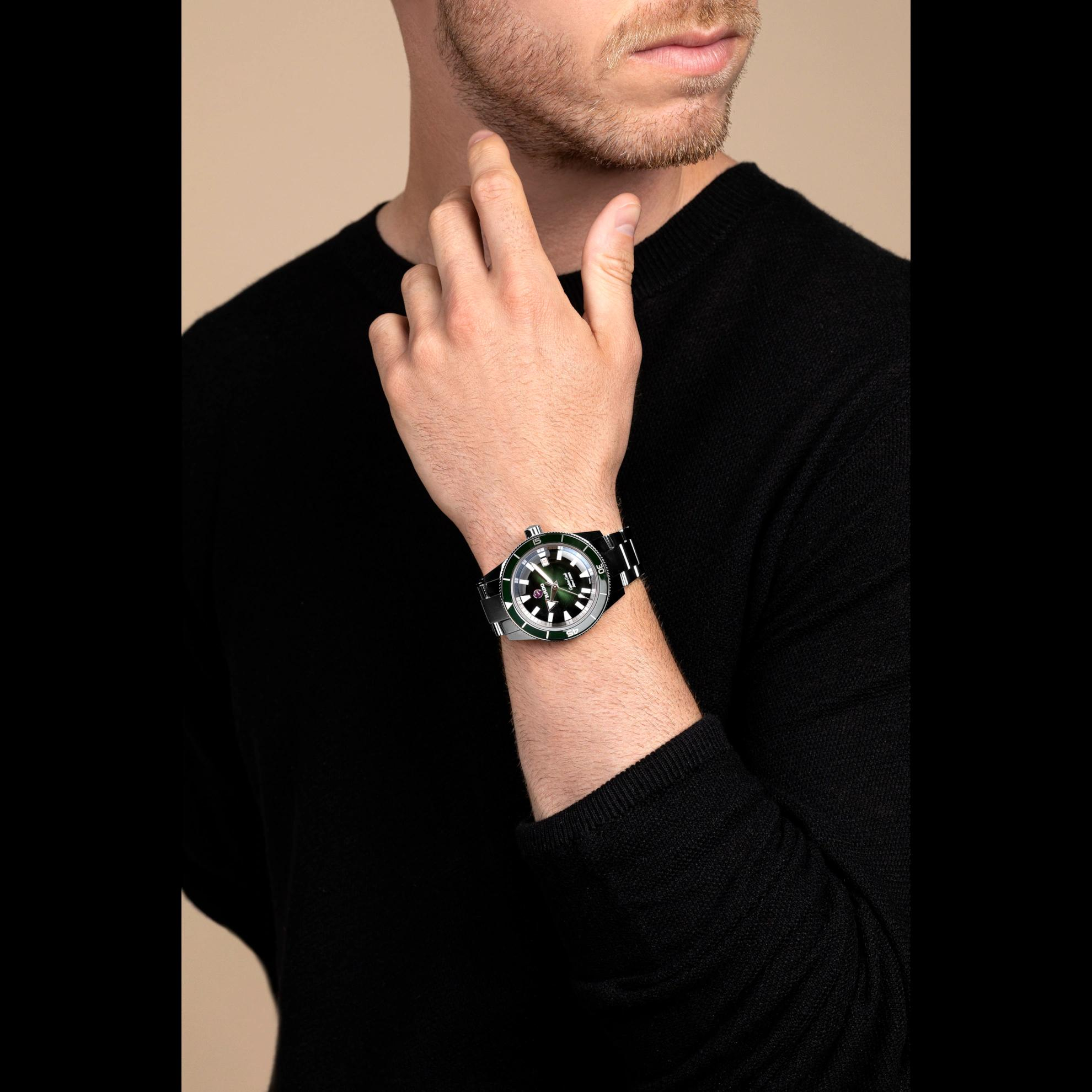 Een originele look uit 1962 is tot leven gebracht in een nieuwe en verbeterde vorm voor de 21e eeuw. Met vintage details en een stijl die trouw is aan het origineel, en up-to-date functies die hem geschikt maken voor moderne dragers, is Captain Cook een horloge dat de tand des tijds kan doorstaan. De nieuwe Captain Cook van 42 mm is waterbestendig tot 30 bar (300 m) en is nu al een hit gebleken bij hedendaagse horlogedragers en moderne ontdekkingsreizigers.