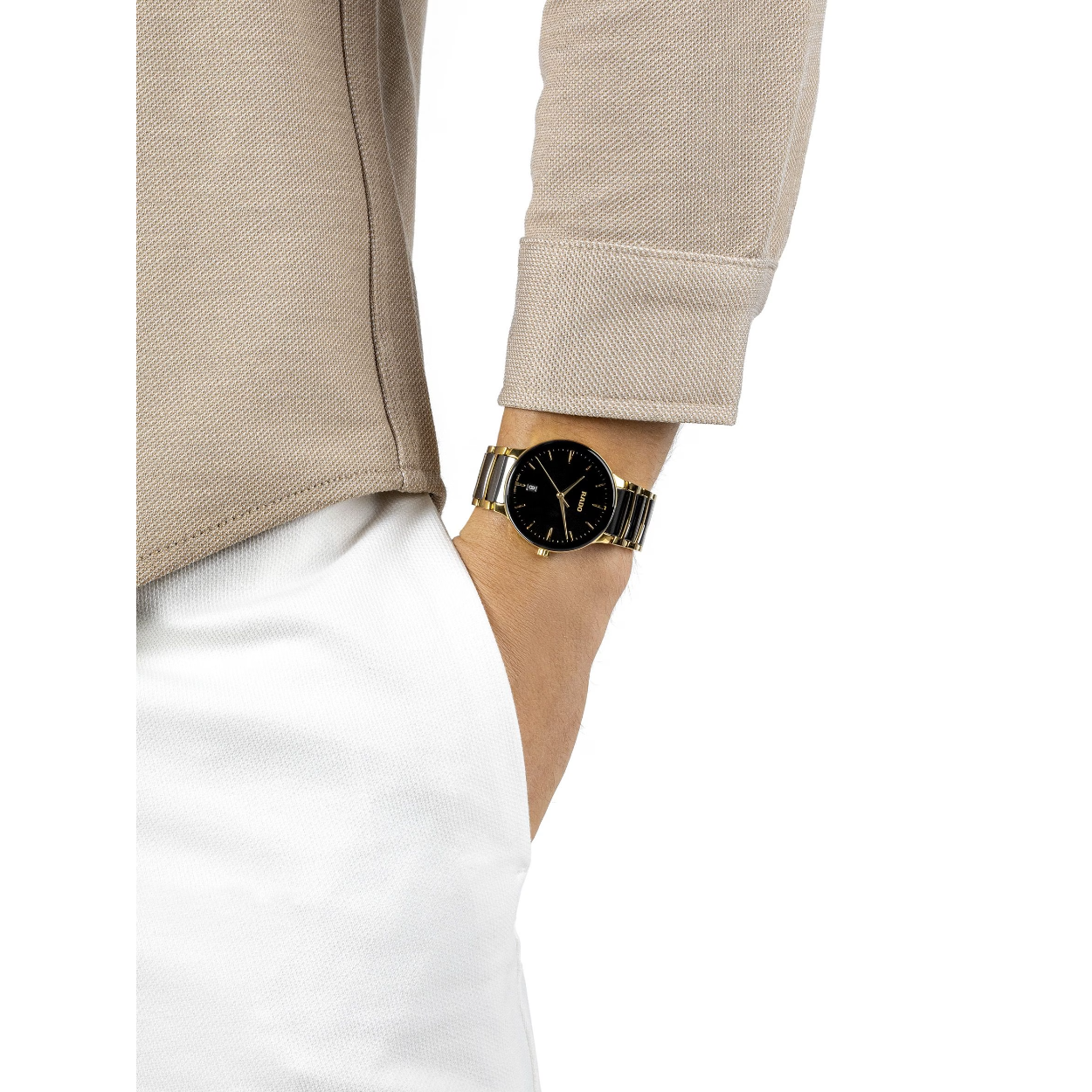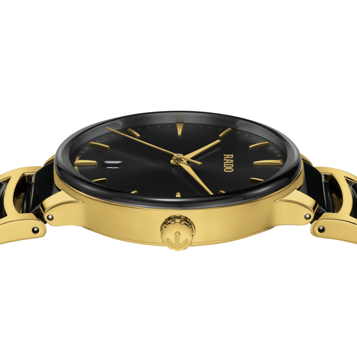 De klassieke Centrix Quartz is niet alleen technisch, maar ook esthetisch herwerkt. Het aangepaste model heeft een afgerond saffierglas dat helemaal doorloopt tot aan de rand en een gebogen kast die overgaat in de gebogen kristalrand. Het algehele uiterlijk van dit iconische uurwerk wordt gecompleteerd met aangepaste kastaanzetten en een armband van gepolijst geelgoudkleurig PVD-gecoat roestvrij staal met zwarte hightech keramische middenschakels. De zwarte sunray wijzerplaat met geelgoudkleurige opgelegde indexen matcht perfect met de geelgoudkleurige wijzers. Dankzij de PreciDrive- en HeavyDrive-functies in het kaliber R073 quartz uurwerk heeft het horloge een grotere nauwkeurigheid en weerstand tegen schokken. Het horloge is waterdicht tot 50 meter.