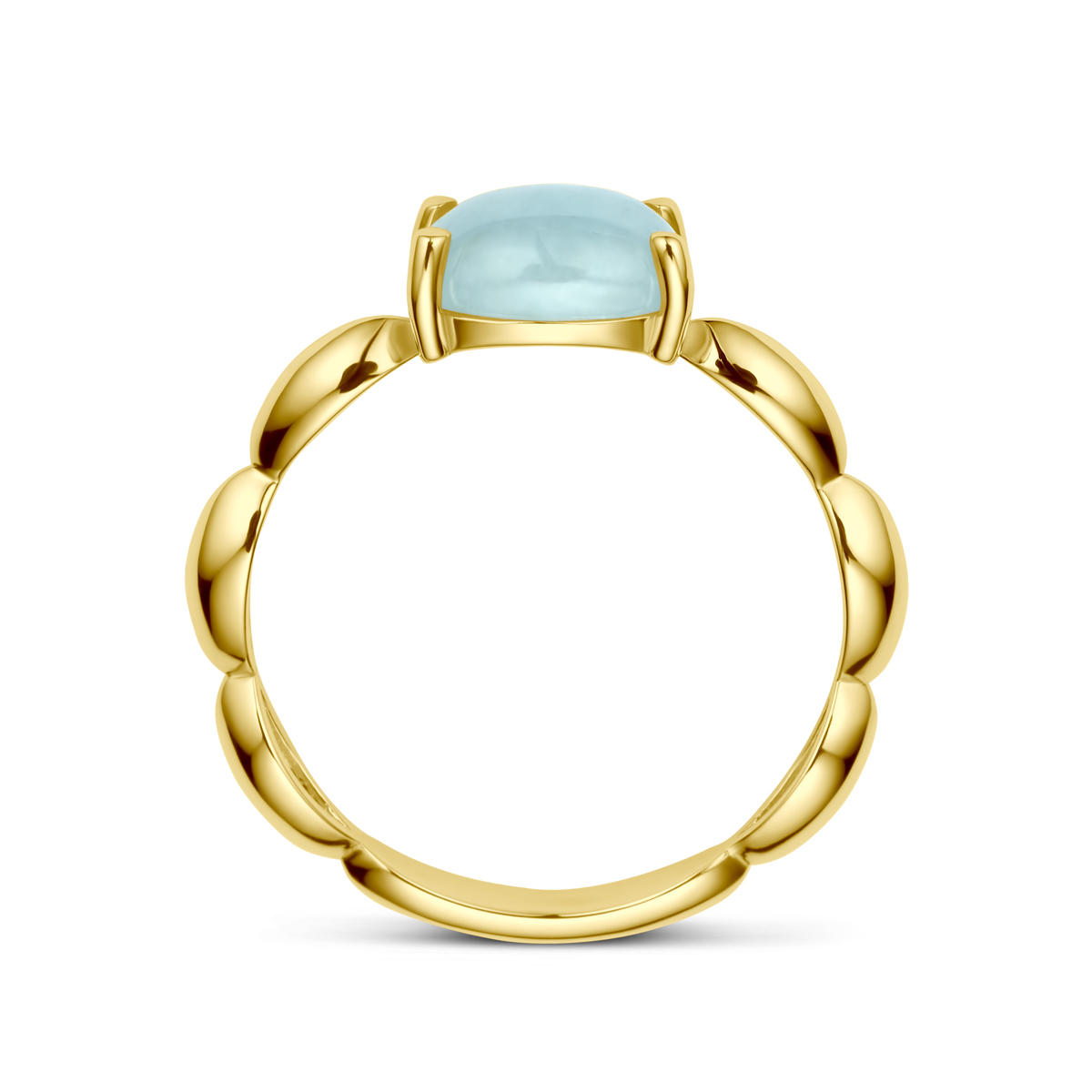 14k Geelgouden ring uitgevoerd met aquamarijn. De steen heeft een afmeting van 8x6mm.