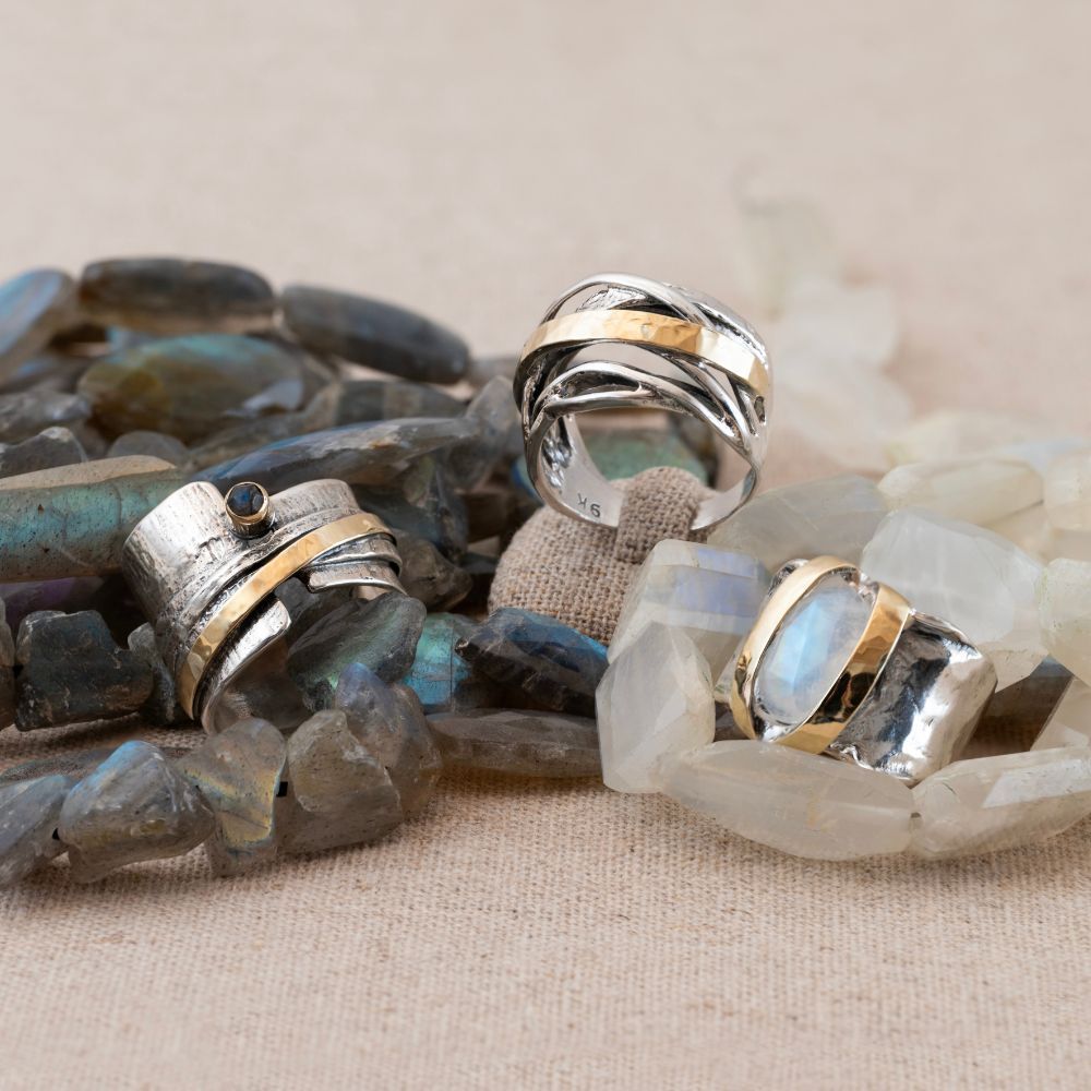 Ring gemaakt van 925 sterling zilver, geoxideerd zilver en 9 karaat. Deze ring is anders dan de gebruikelijke ringen, in plaats van bewegende bandjes heeft deze ring bogen.