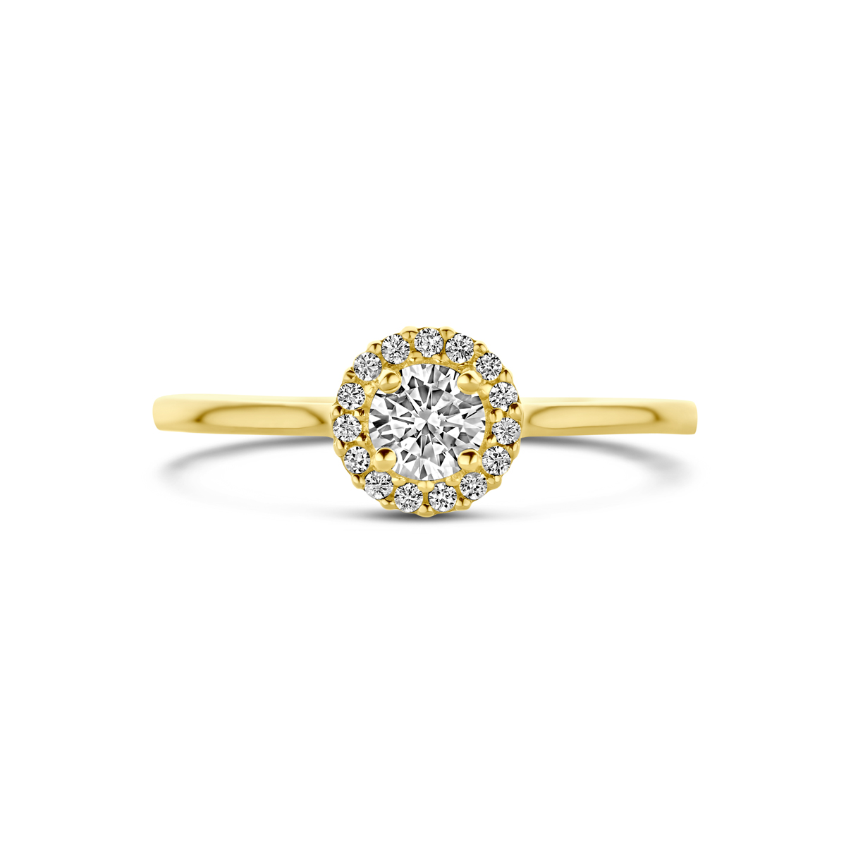 14k Geelgouden ring uitgevoerd met zirkonia. De ring heeft een breedte van 6.5mm. Rozetvorm, maat 17.25