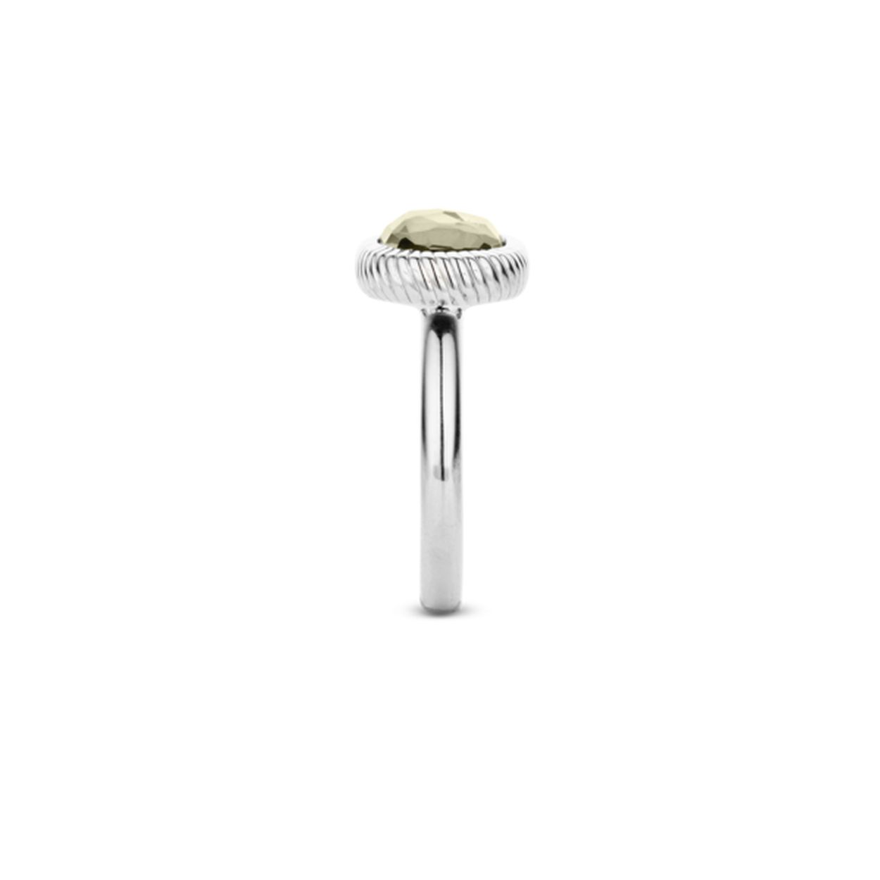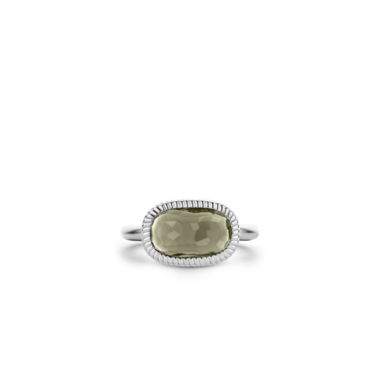 Deze gefacetteerde rechthoekig geslepen steen in grijsgroen is geplaatst in een zilveren ring met een gevlochten textuur. Dit design is een eye-catcher.
