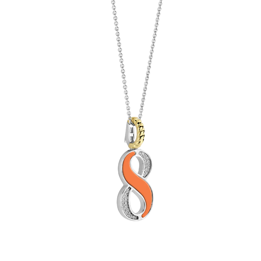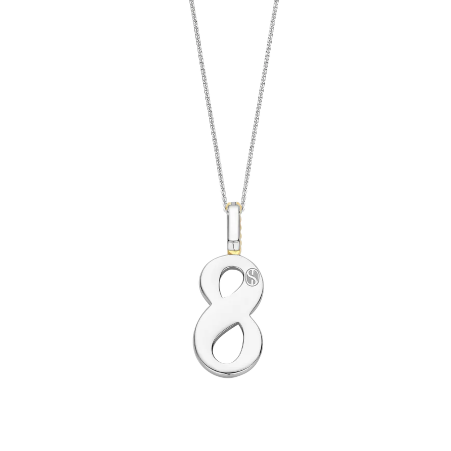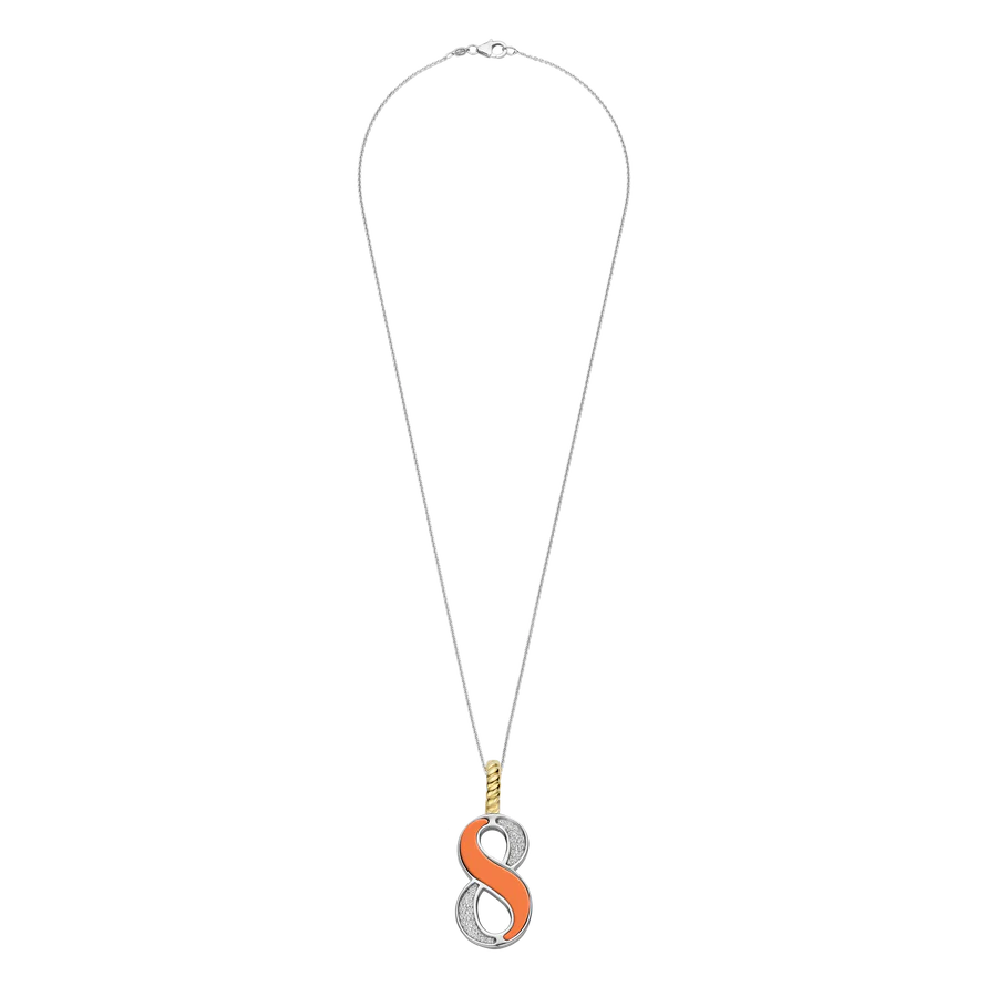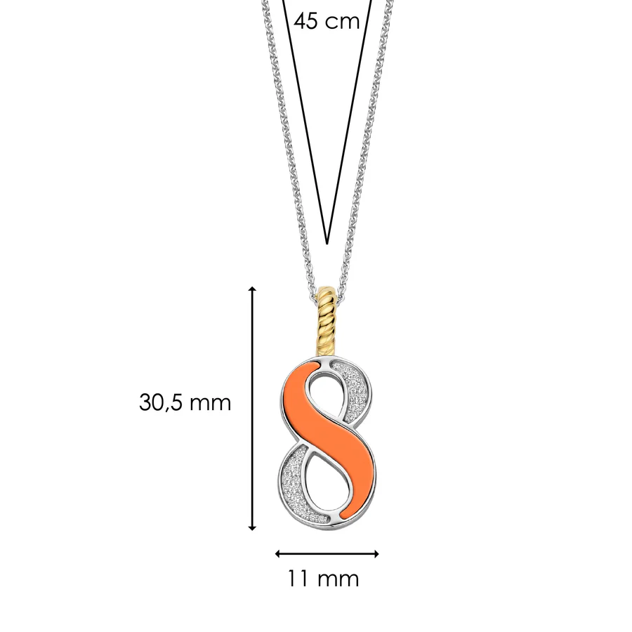 Omarm levendige energie met deze TI SENTO Nummer Acht Zilveren Hanger 6841OR_8. Gemaakt van hoogwaardig 925 sterling zilver en verzilverd om een langdurige glans te waarborgen, heeft deze hanger een opvallend ontwerp van het cijfer acht. Het cijfer is versierd met een betoverende oranje steen, die warmte en optimisme oproept. Een sprankelend pavé van witte cubic zirconia steentjes maakt het ontwerp compleet en biedt een prachtig contrast. De clipring is verguld, wat een luxueuze en stralende uitstraling geeft. Acht symboliseert oneindigheid, harmonie en manifestatie. Oranje, een kleur van creativiteit en enthousiasme, geeft deze hanger een dynamische uitstraling. Dit sieraad is perfect voor de moderne vrouw die op zoek is naar zelfverzekerdheid en vitaliteit. Laat deze hanger de vonk zijn die je dag laat stralen. Draag hem solo voor een gedurfd statement of combineer hem met andere geluksgetal-hangers voor een gelaagde look die vertrouwen en allure uitstraalt. De hanger wordt geleverd met een delicate zilveren ketting van 45 cm en is hypoallergeen en nikkelvrij, wat zorgt voor langdurig comfort en kwaliteit.