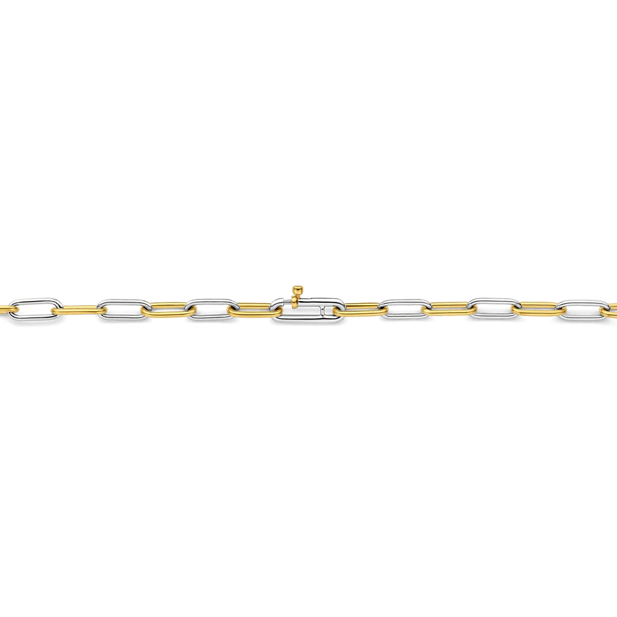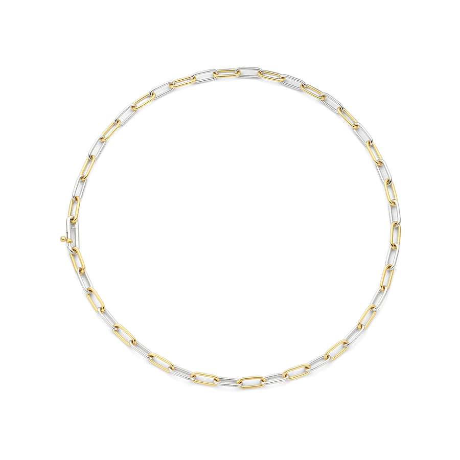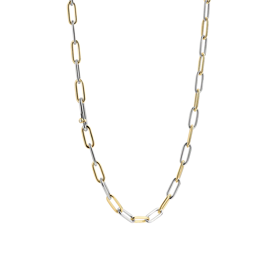 Vier gedurfde verbondenheid met dit TI SENTO vergulde collier 3947BI. De kenmerkende closed-forever schakels grijpen in elkaar in een eindeloos ritme van contrast en elegantie. Vervaardigd uit hoogwaardig 925 sterling zilver wisselt iedere schakel af tussen een slanke platinakleurige afwerking en een stralende goudkleurige vergulding, wat zorgt voor een dynamisch samenspel van koele en warme tinten. De sculpturale, langgerekte schakels geven dit statement schakelcollier een moderne edge, terwijl het tijdloze palet blijvende verfijning waarborgt. Of het nu wordt gedragen als opzichzelfstaand middelpunt of gecombineerd met verfijnde colliers, dit sieraad verankert elke look met ingetogen kracht en zelfvertrouwen. Dit high-end stuk staat symbool voor duurzame verbondenheid, eigentijds design en verfijnd vakmanschap. Ideaal om te layeren, te stylen met charms of minimalistische outfits te versterken. Nikkelvrij en hypoallergeen, het garandeert comfort en blijvende allure.