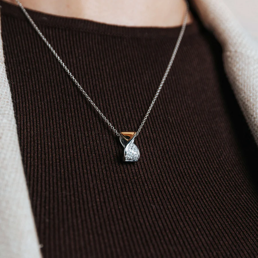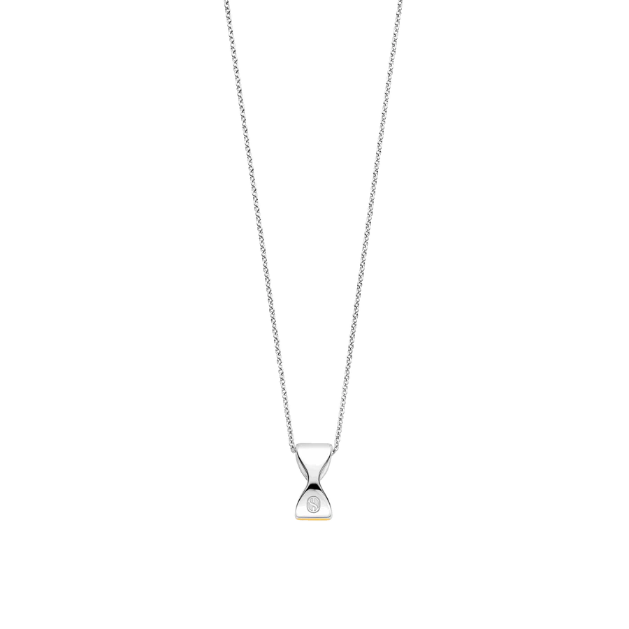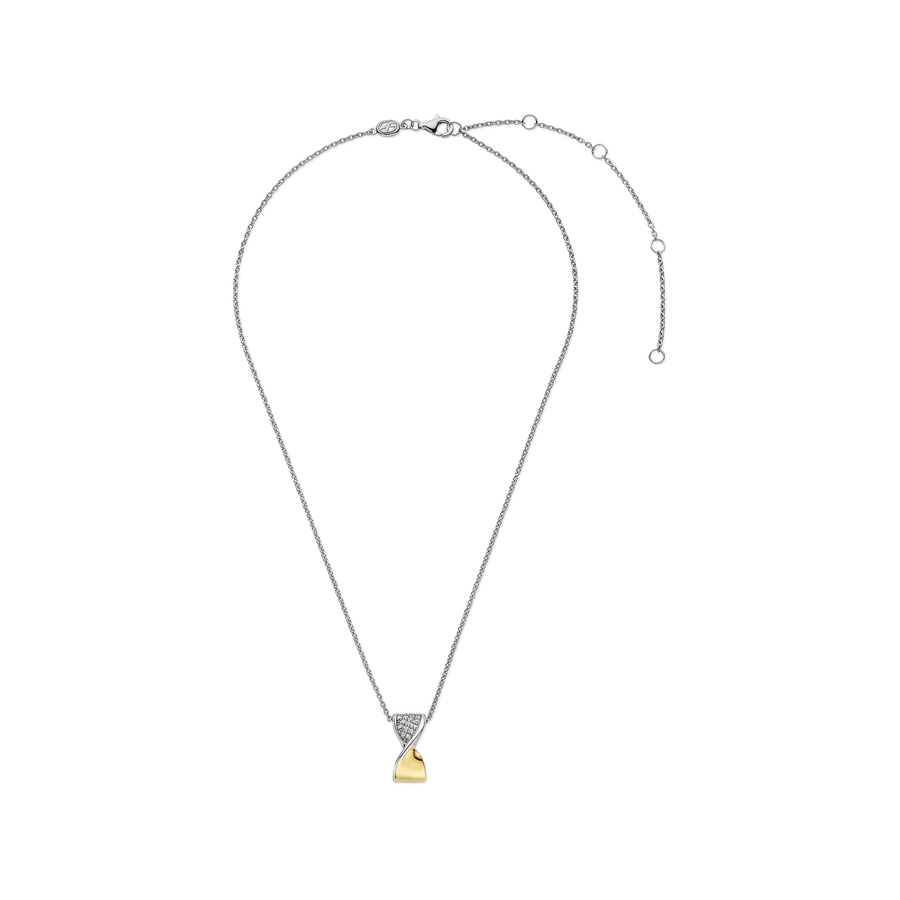 Vier contrast en beweging met dit TI SENTO vergulde collier 34106ZY. Vervaardigd uit 925 sterling zilver toont dit collier een gedraaid silhouet waar warme goudkleurige vergulding samenkomt met pavé fonkeling. Het bovenste deel van de hanger schittert met met de hand gezette witte zirconia, terwijl de gepolijste goudkleurige basis rijkdom en moderne elegantie toevoegt. Hangend aan een fijn zilveren collier rust de hanger sierlijk op het sleutelbeen, perfect voor verfijnde layering of als opzichzelfstaand detail. Dit ontwerp vormt een brug tussen geometrische structuur en vloeiende vrouwelijkheid en maakt het tot een veelzijdige keuze voor styling van dag tot avond. Of het nu wordt gecombineerd met tailored basics of vloeiende stoffen, het brengt een subtiele vonk van onderscheid. Nikkelvrij en hypoallergeen, dit collier is even comfortabel als betoverend.