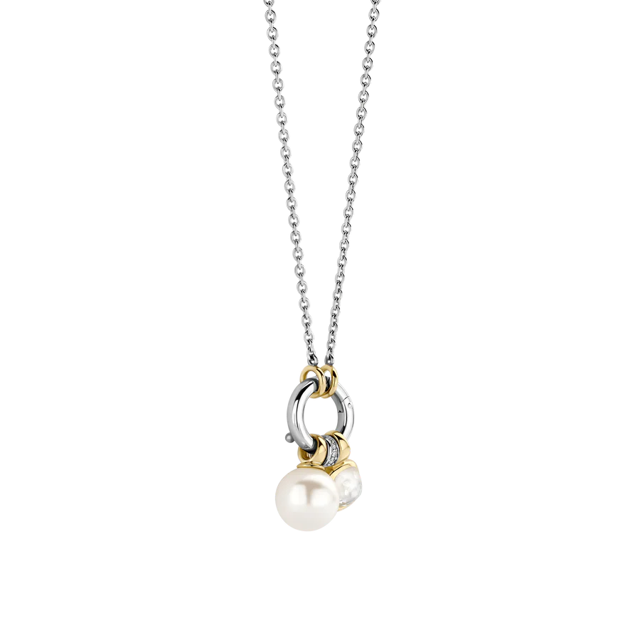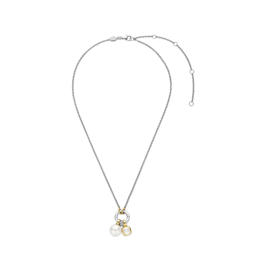 Vier zachte elegantie met dit TI SENTO vergulde collier 34114YP, waar delicate details en verfijnde materialen samenkomen. Vervaardigd uit 925 sterling zilver en afgewerkt met een stralende goudkleurige vergulding is dit collier voorzien van een signature cirkelschakel waaraan twee verschillende charms hangen: een gladde parelkraal en een kussenvormige parelmoersteen, omlijst door een goudkleurige zetting. Een subtiel pavé accent voegt een vleugje fonkeling en lichtspel toe. Dit vrouwelijke hanger-collier is een sierlijk sieraad dat klassieke parelcharme verenigt met eigentijds hangerdesign. Of je nu op zoek bent naar een parelcollier, een betekenisvol cadeau voor haar of een elegant stuk om je sieradencollectie te verrijken, dit collier brengt zachte verfijning in elke look. Ideaal om te combineren met fijne goudkleurige colliers of alleen gedragen als middelpunt, het maakt moeiteloos de overgang van dag naar nacht. Nikkelvrij en hypoallergeen, het belooft blijvend draagcomfort naast een tijdloze aantrekkingskracht.