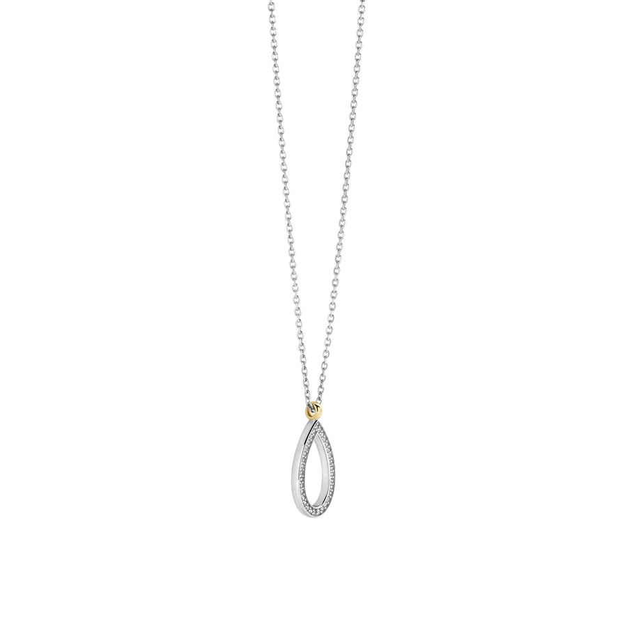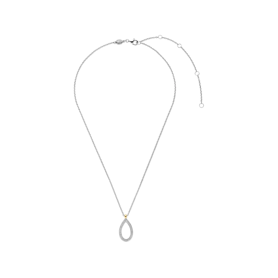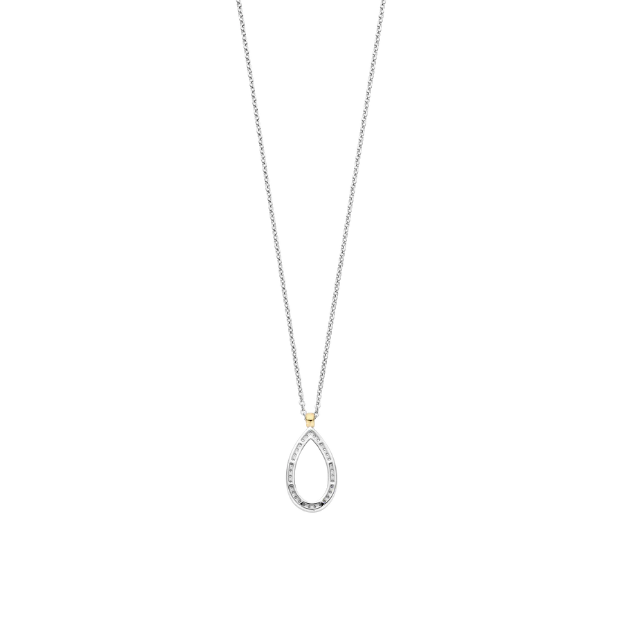 Vier verfijnde eenvoud met dit TI SENTO vergulde collier 34110ZY. Een slank druppelvormig silhouet, omlijst door een halo van met de hand gezette witte zirconia, vangt het licht bij elke beweging. De warme goudkleurig vergulde houder voegt een subtiel contrast toe en benadrukt de elegante rondingen van de hanger. Vervaardigd uit hoogwaardig 925 sterling zilver en afgewerkt met een platinakleurige vergulding voor blijvende schittering is dit collier een verfijnd essentieel stuk in elke sieradencollectie. Het open druppelontwerp roept zachtheid en vloeiendheid op en maakt dit collier tot een subtiel statement van gratie en vrouwelijkheid.