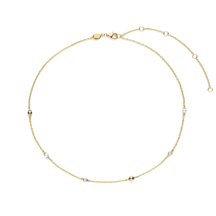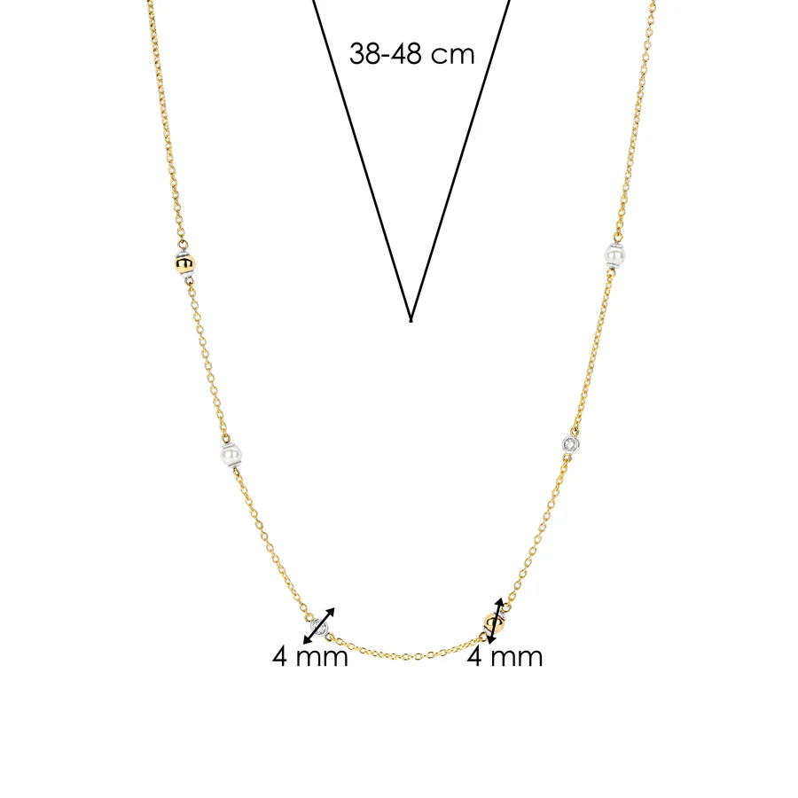 De TI SENTO ketting 34097ZY is een delicate compositie van moderne luxe, geïnspireerd door de gouden warmte van de zomer. Gemaakt van hoogwaardig 925 sterling zilver, is de vergulde ketting versierd met glanzende witte parels, gepolijste kralen en bezel gezette cubic zirconia stenen. Elk element weerspiegelt de stralende zon, waardoor een verfijnde maar moeiteloze gloed ontstaat. Ontworpen voor elegante gelaagdheid of een subtiele look, vangt deze ketting de essentie van zonovergoten dagen en sterren verlichte nachten, waardoor het een perfecte metgezel is voor elke zomeroutfit. Nikkelvrij en hypoallergeen, het zorgt voor luxueus comfort bij elk draagmoment. Laat deze goudkleurige schoonheid je look verlichten met tijdloze verfijning en moeiteloze elegantie.