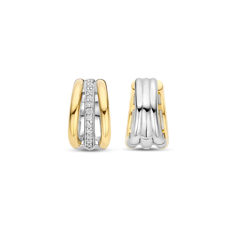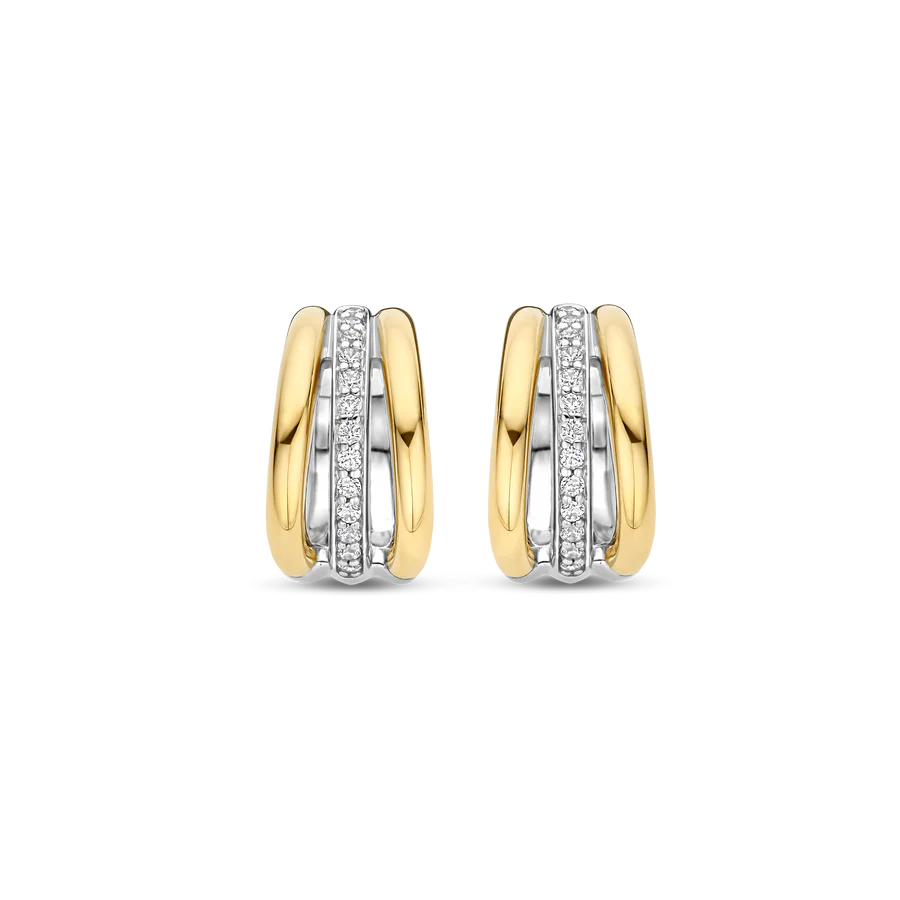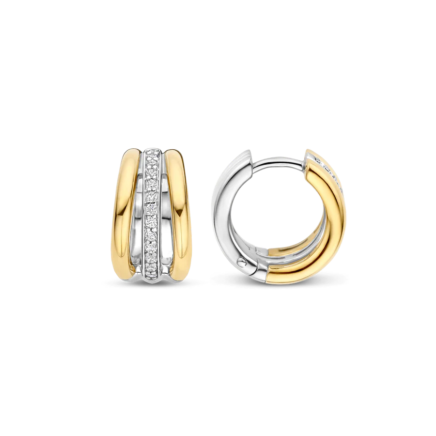 Deze TI SENTO oorbellen 78010ZY combineren diepte, contrast en schittering. Gemaakt van 925 sterling zilver, hebben ze een driedubbel hoepelontwerp: twee goudkleurige banden omarmen een platinakleurige hoepel met pavé gezette cubic zirconia. Deze oorbellen voegen een elegante touch toe aan elke outfit. De veilige scharnier sluiting zorgt voor comfort, waardoor ze de hele dag gedragen kunnen worden. Nikkelvrij en hypoallergeen voor luxueus comfort. Een mix van gouden warmte, ijzige schittering en eigentijds design, perfect voor elke gelegenheid.