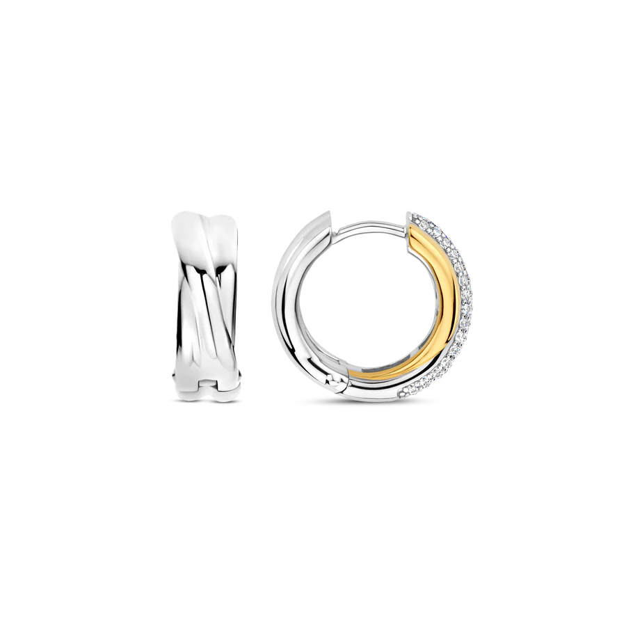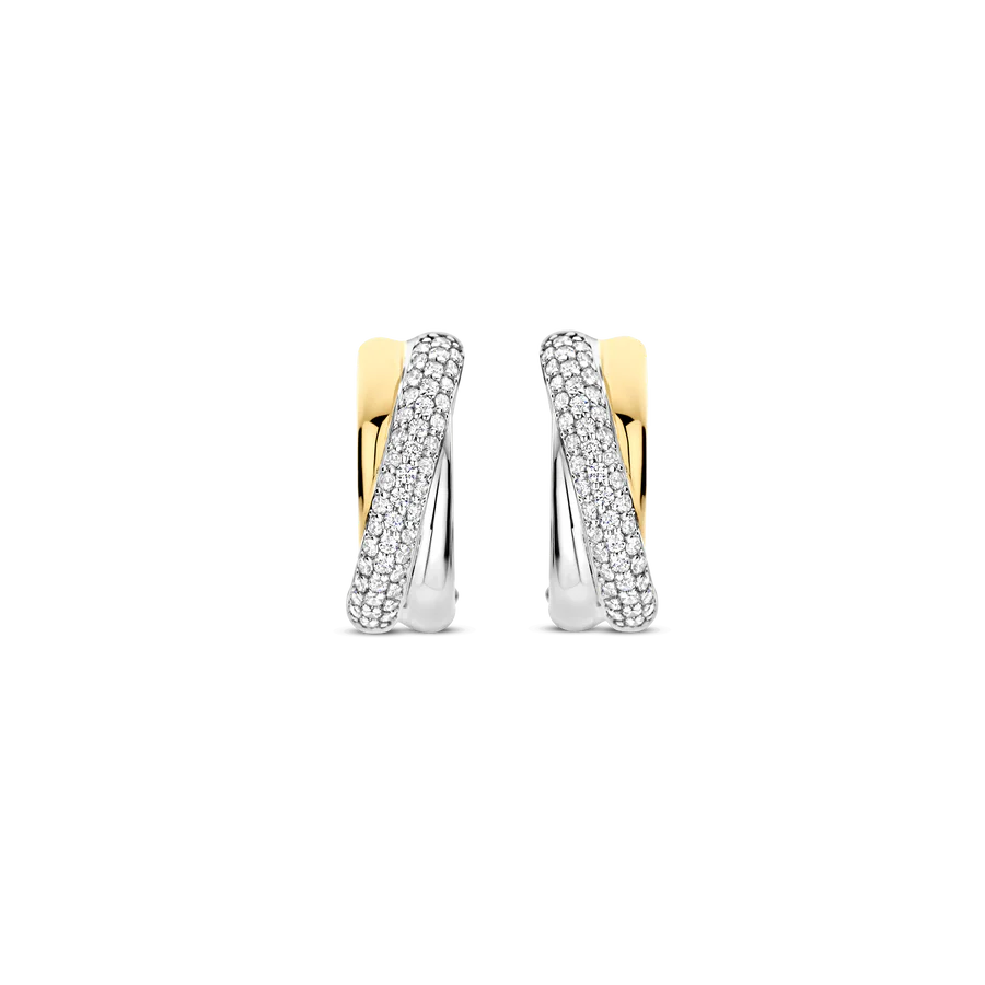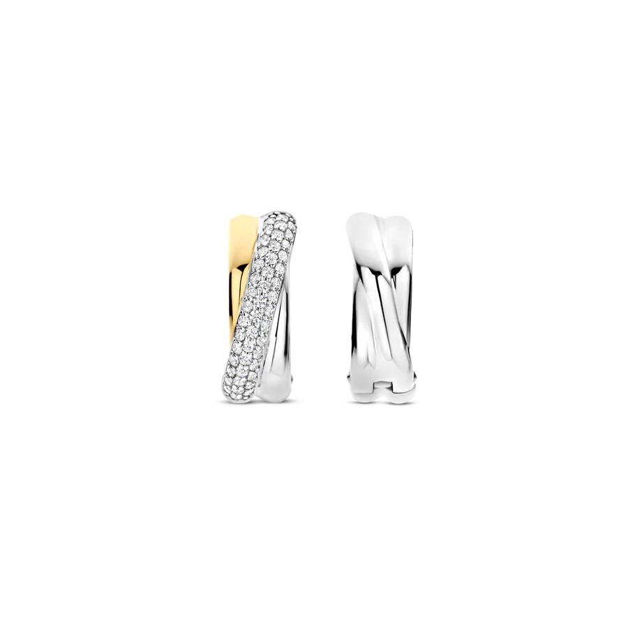 Deze TI SENTO oorbellen 78012ZY combineren textuur en schittering. Gemaakt van 925 sterling zilver, hebben ze een elegant verweven ontwerp met een vergulde band en een platinakleurige streng met pavé gezette cubic zirconia. Dit contrast zorgt voor een tijdloze en eigentijdse look. Deze oorbellen voegen een vleug glamour toe aan zowel casual als elegante outfits. De veilige scharnier sluiting zorgt voor comfort, waardoor ze de hele dag gedragen kunnen worden. Nikkelvrij en hypoallergeen voor luxueus comfort. Of je nu geniet van zomermomenten of avondelijke elegantie, deze oorbellen brengen stralende charme aan je sieradencollectie.
