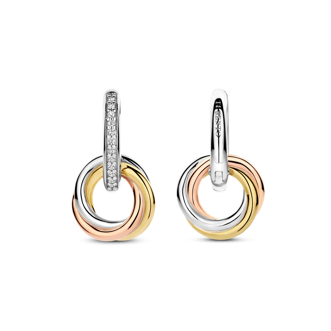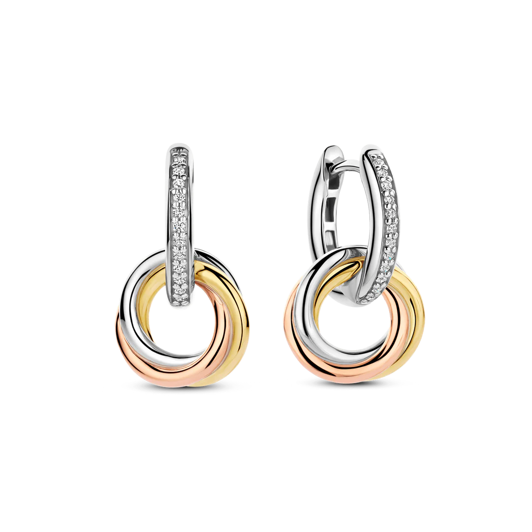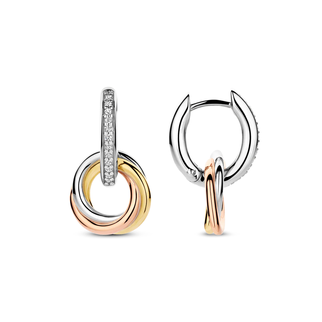 Ontdek stralende harmonie met deze TI SENTO driekleurige zilveren oorbellen 7857ZT. Vervaardigd uit 925 sterling zilver, heeft elke ring zijn eigen karakter: één is goudkleurig verguld, één rosékleurig verguld en één platinakleurig verguld met volledig pavé-gezette briljant witte cubic zirconia. Het gearticuleerde ontwerp laat de ringen onafhankelijk meebewegen, waardoor ze het licht vangen en een subtiel spel van warme, blush- en koele tinten creëren. Draag ze om je dagelijkse looks een elegante touch te geven, of combineer ze ’s avonds met verfijnde huggies voor een zorgvuldig samengestelde ear stack. Nikkelvrij en hypoallergeen, voor luxe comfort van ’s ochtends tot ’s avonds.