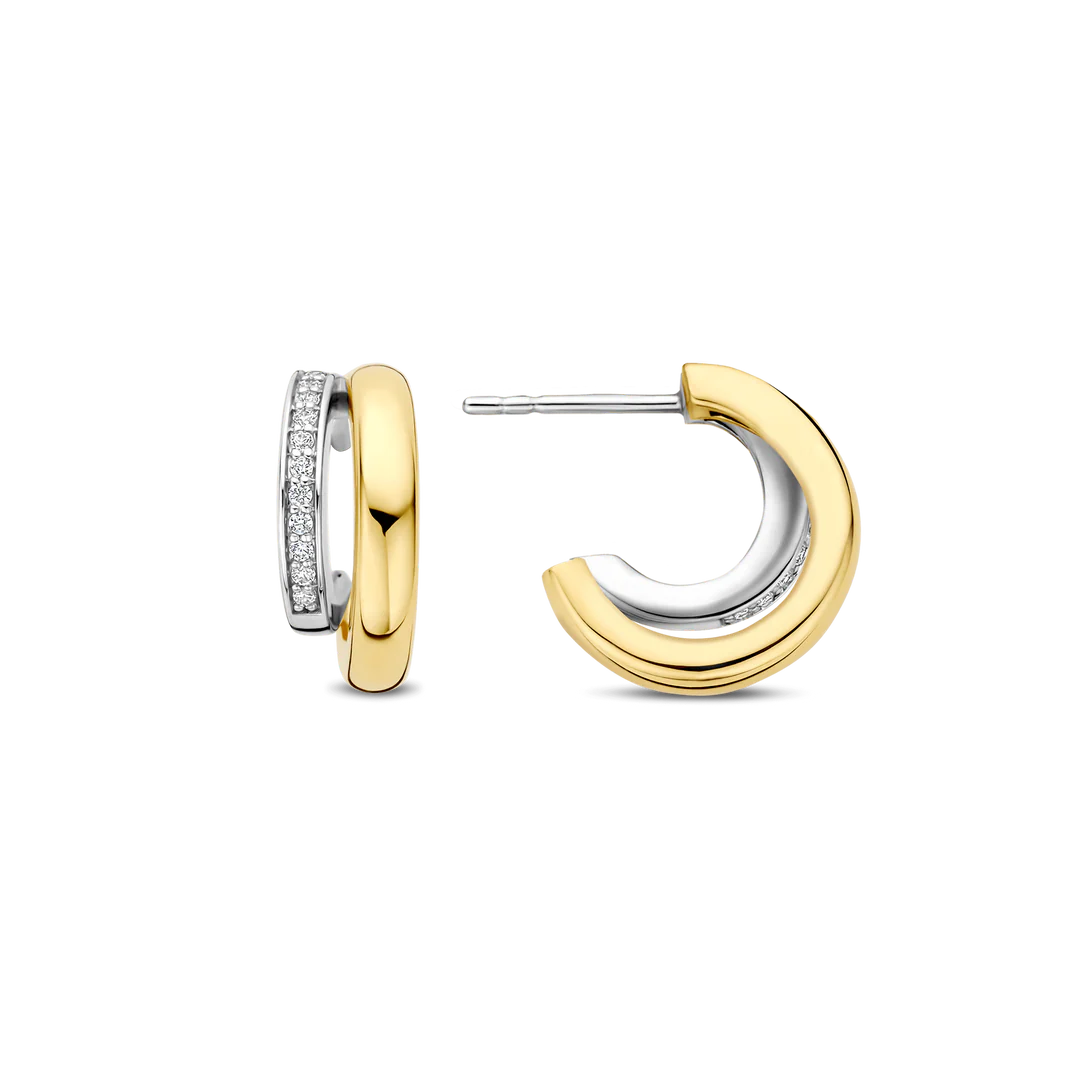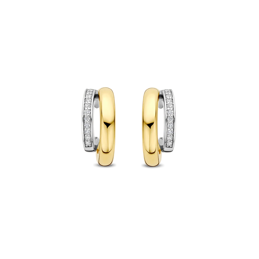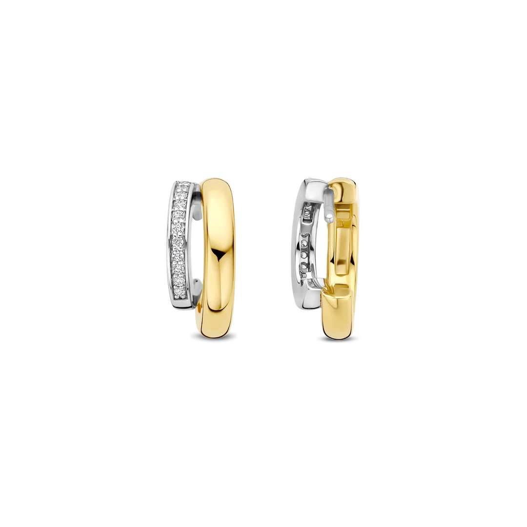 Omarm sculpturaal contrast met deze TI SENTO goudkleurig vergulde zilveren oorbellen 78035ZY. Vervaardigd uit 925 sterling zilver, vormt elke oorbel een gedurfde, asymmetrische ring bestaande uit twee in elkaar grijpende bogen: één strak en goudkleurig verguld, de ander platinakleurig verguld en pavé-gezet met briljant geslepen witte cubic zirconia. De vloeiende compositie creëert een subtiel samenspel van licht, kleur en textuur—perfect om zowel minimalistische outfits als avondlooks te verrijken. Compact maar opvallend, bieden ze een verfijnde twist aan klassieke hoops. Nikkelvrij en hypoallergeen, ze garanderen moeiteloze elegantie en draagcomfort voor de gevoelige oren gedurende de hele dag.
