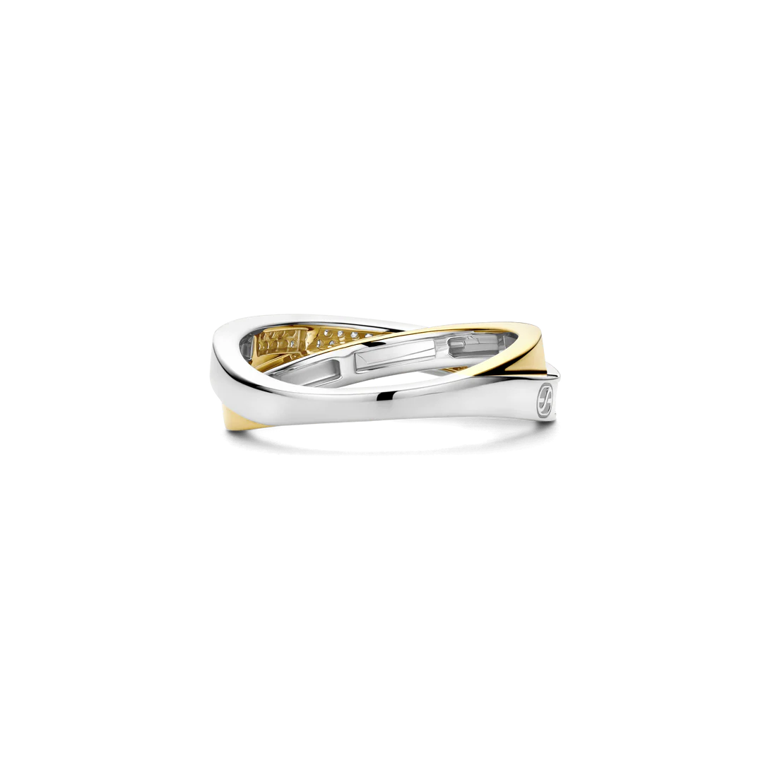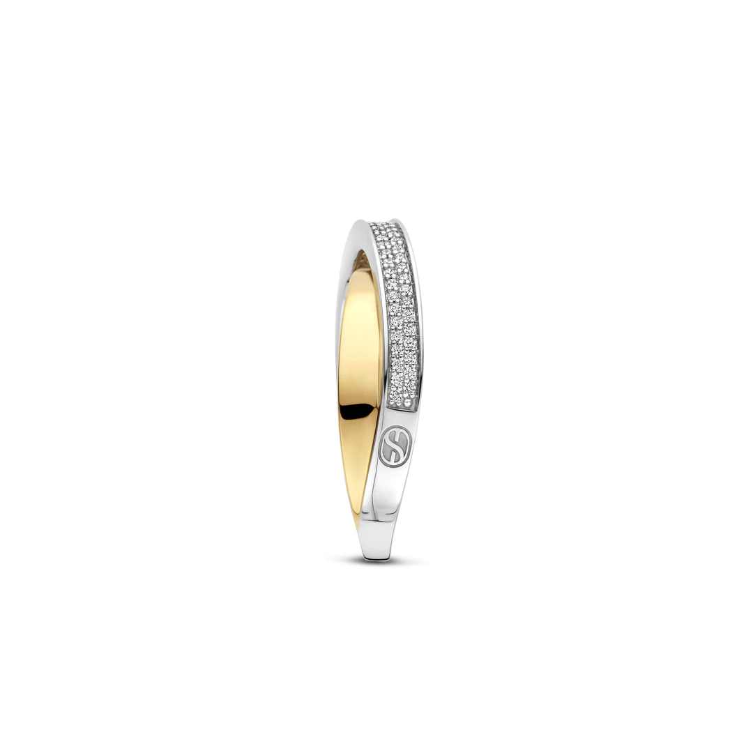 Omarm moeiteloze dualiteit met deze TI SENTO vergulde ring 12395ZY. Vervaardigd uit 925 sterling zilver verenigt dit crossover-ontwerp twee sculpturale banden: één goudkleurig verguld, de ander platinakleurig verguld en pavé gezet met briljant geslepen witte zirconia. De vloeiende lijnen draaien in elkaar en creëren een verfijnd contrast van schittering en glans, wat subtiele beweging en fonkeling toevoegt aan elk gebaar. Alleen gedragen maakt hij een elegant statement, gecombineerd in een stack voegt hij diepte en textuur toe aan je dagelijkse collectie. Nikkelvrij en hypoallergeen, deze ring biedt blijvend comfort met een gepolijste, moderne afwerking.