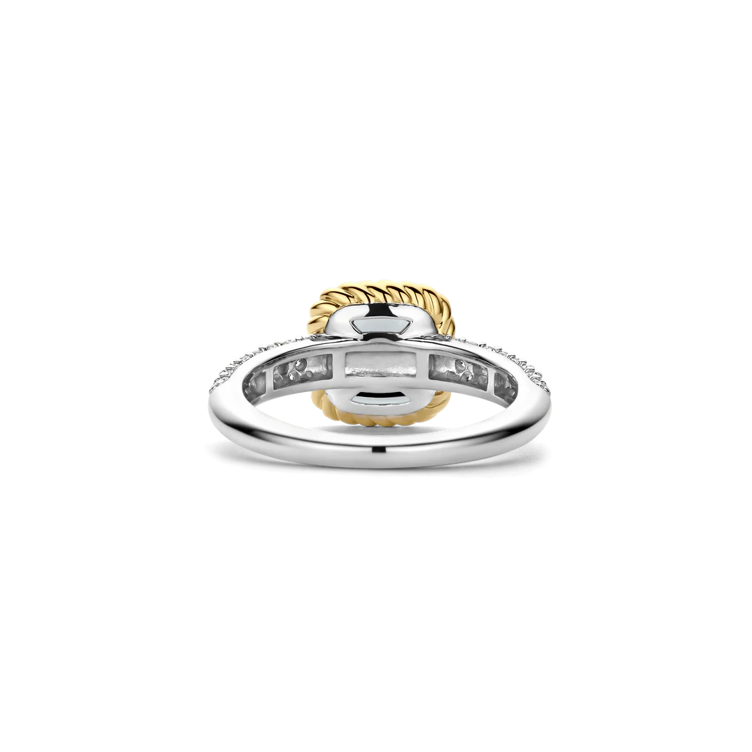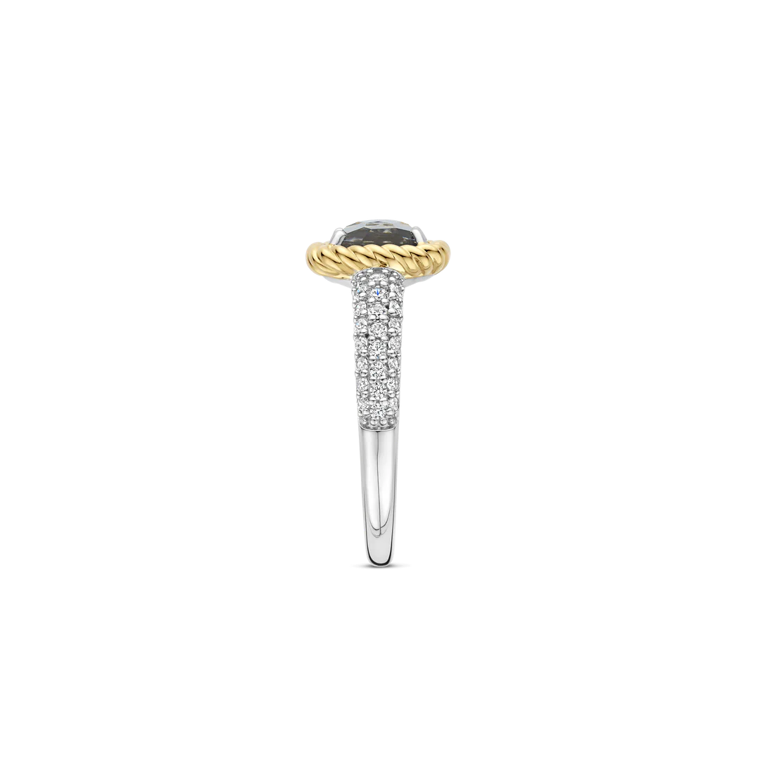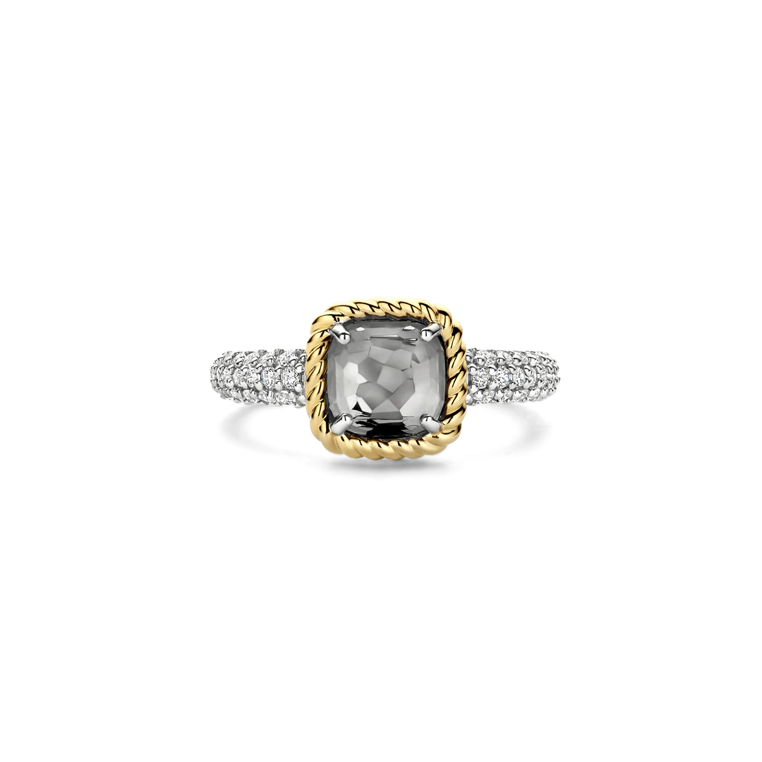 Omarm tonale elegantie met deze TI SENTO vergulde ring 12399GG. Vervaardigd uit 925 sterling zilver toont dit kussenvormige ontwerp een transparante grijze steen, fijn gefacetteerd en omlijst door een gedraaide goudkleurige klauwzetting. De platinakleurig vergulde band is pavé gezet met briljant geslepen witte zirconia en voegt een zachte fonkeling toe die de mysterieuze diepte van de steen versterkt. Elegant in zijn eenvoud verenigt deze ring vintage charme met moderne veelzijdigheid, perfect om alleen te dragen of als onderdeel van een zorgvuldig samengestelde ringstack. Nikkelvrij en hypoallergeen, hij biedt blijvend comfort en moeiteloze verfijning.